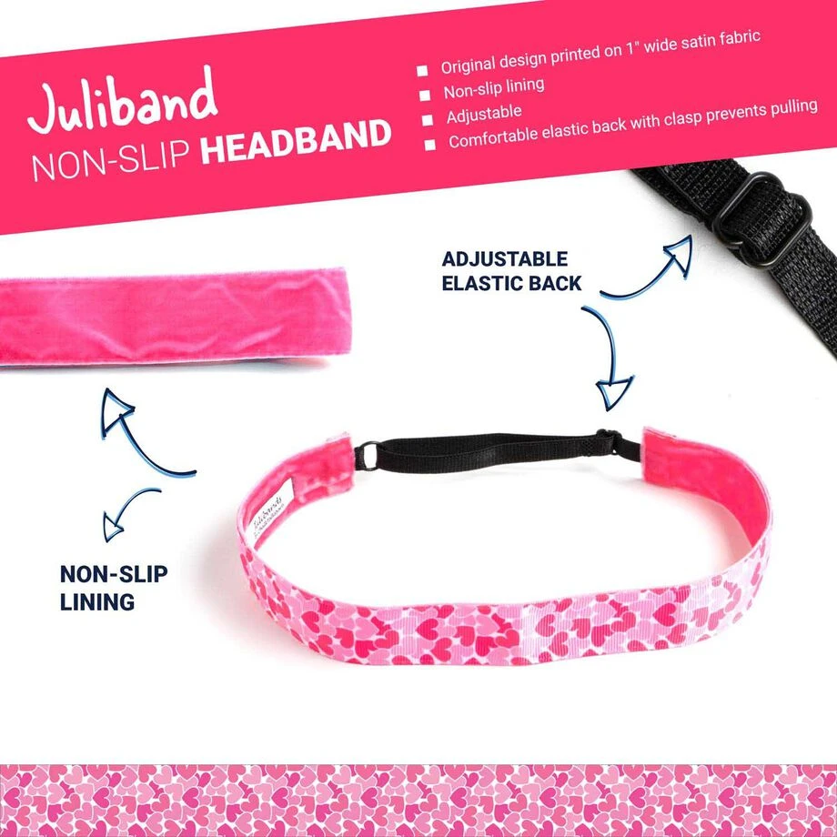 Our love-filled athletic headband features an all-over heart pattern. The comfortable Juliband headband is backed with a non-slip velvet to ensure your hair stays put through any activity. The headband is fully adjustable for the best custom fit. This stylish and unique headband makes the perfect accessory to any outfit.