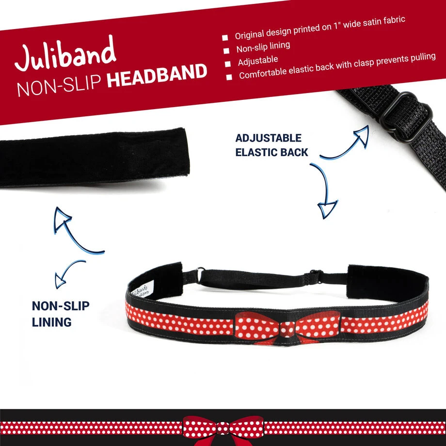 Complete your outfit with this eye-catching and adjustable non-slip running headband. Our comfortable Juliband headband is backed with a non-slip velvet to ensure your hair stays put through any activity. The headband is fully adjustable for the best custom fit. The stylish Polka Dots & Bows headband is an ideal accessory for all the magical runners who love to dress up for their runs.