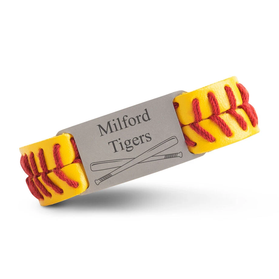 This snap closure leather softball bracelet with engraved slider is sure to be a favorite for players and is a great piece of everyday softball jewelry. The adjustable bracelet fits different sized wrists for a comfortable and attractive way to show a love for softball in a unique way, as the bracelet is stitched to look as if it were made from an actual softball. The engraved slider with a personalized softball design is sure to make a great gift for any player or team!