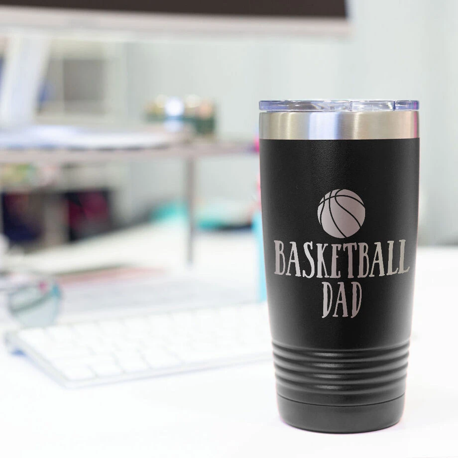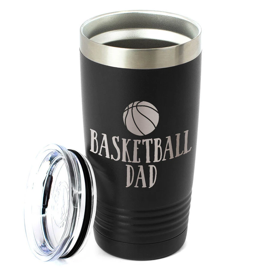 Show your dad how much you appreciate all that he does with this unique basketball dad travel mug, this mug is sure to a favorite for coffee on the go. Our 20 oz. hot/cold insulated tumbler is the perfect choice for coffee – or any beverage – and keeps them near optimal temperatures for as long as possible. Utilizing double-wall vacuum insulation, the tumbler ensures hot drinks stay hot and cold drinks stay cold for as long as possible. Laser engraved with a bold design, this tumbler is great gift for that special someone that is sure to be put to good use almost every day.
