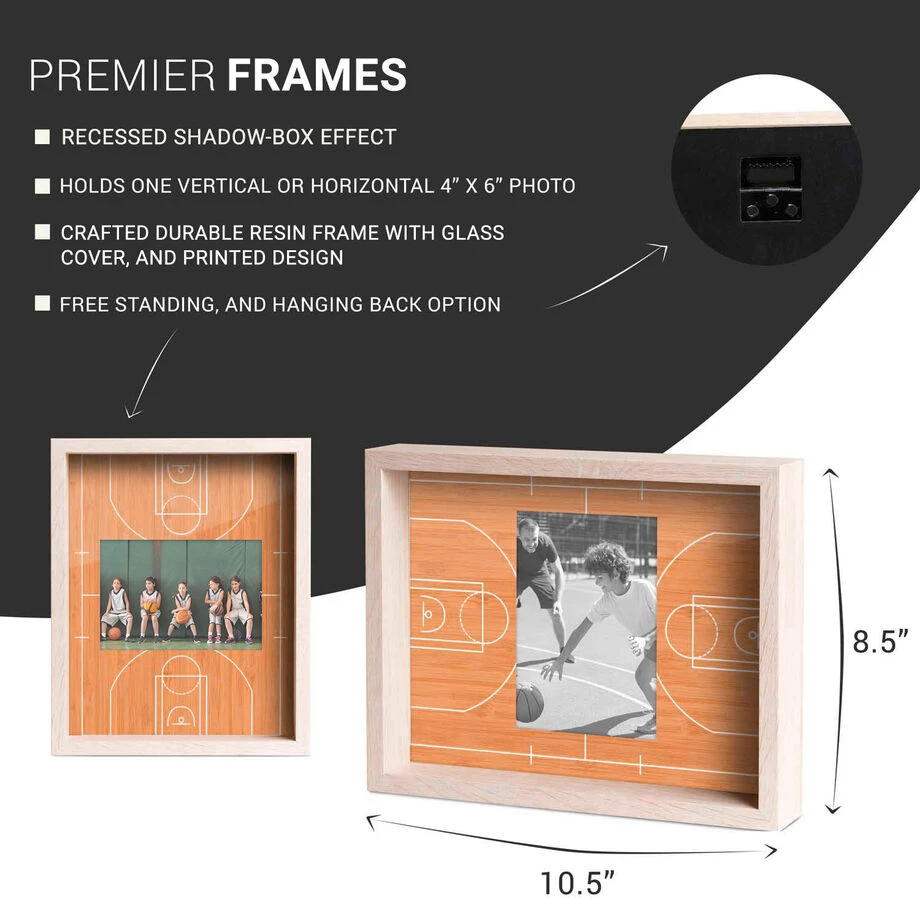 Our Premier Basketball Frame features a unique high quality printed basketball court design on glass, that compliments any photo, making it the perfect gift for every occasion. Add an extra sentiment to the glass by autographing your name and # or writing a personal message. This 10 1/2″ x 8 1/2″ frame can capture that one treasured moment in a 4″ x 6″ photo. Best of all, you can showcase your frame like a shadow box by displaying it on a table or hanging it on a wall. This frame exemplifies all the beauty having a glass cover, with a durable wood-like resin texture and an autograph feature to write in your own special touch. Admire your love of basketball with this one of a kind frame, truly the best gift you can give to the athlete in your life.