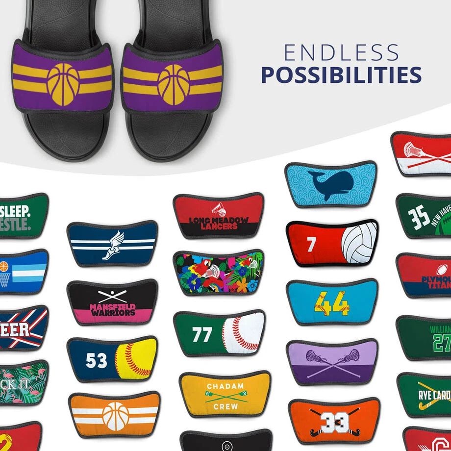 Show off that basketball pride everywhere you go with a pair of basketball Repwell® slide sandals and the interchangeable design straps. With the removable design straps you can mix and match different straps and represent different sports and designs all on one pair of sandals. With the endless possibilities for designs these Repwell® slide sandals and straps make for a great gift not just for a player but for the whole team.