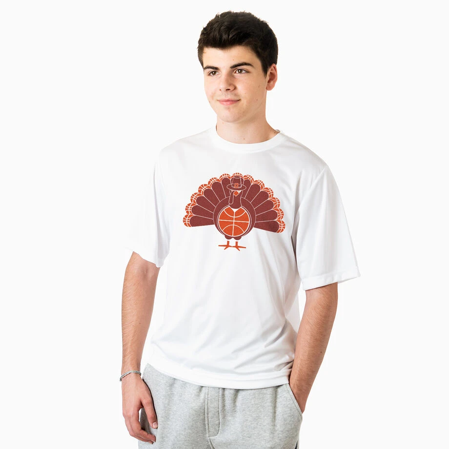 Gear up for a game, practice or activity with our short sleeve tech tee with a basketball design, this is the perfect tee to show off that basketball pride. This moisture-wicking short sleeve athletic tech tee is great way to keep you dry during all activities or daily wear. With UV protection it will be sure to protect your skin as well. This shirt also makes for a great gift for any occasion.