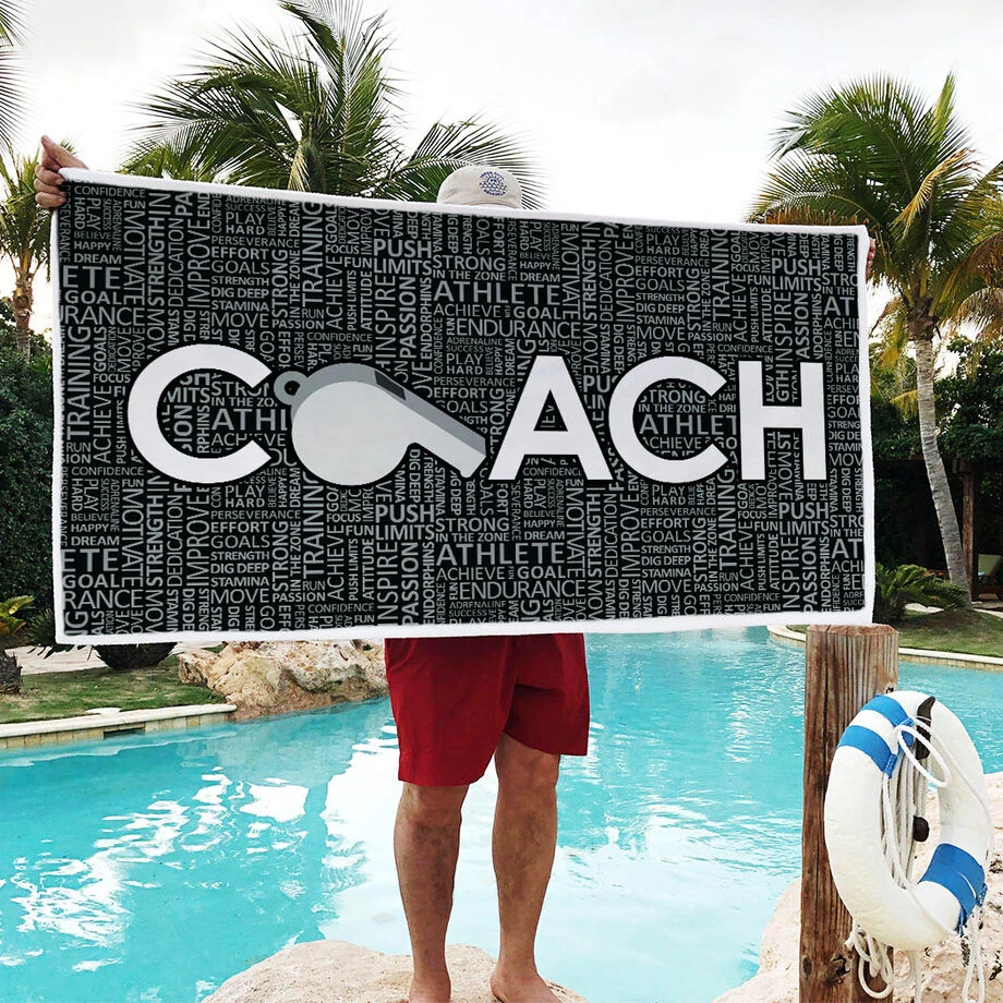 Any coach will love to show off that enthusiastic pride and accomplishments at the pool or beach with one of our super absorbent premium towels. This densely thick woven premium towel is luxuriously soft and absorbent, which makes it the perfect towel for home, beach, or pool. The 60″ X 30″ plush towel can also easily double as a beach and pool blanket.