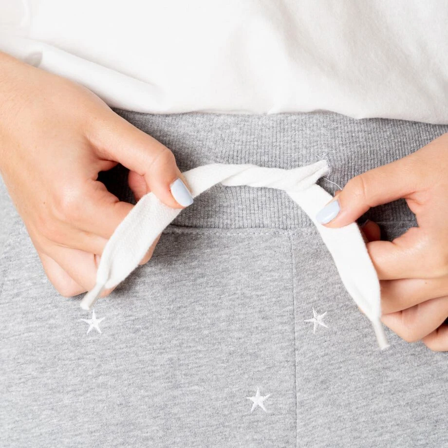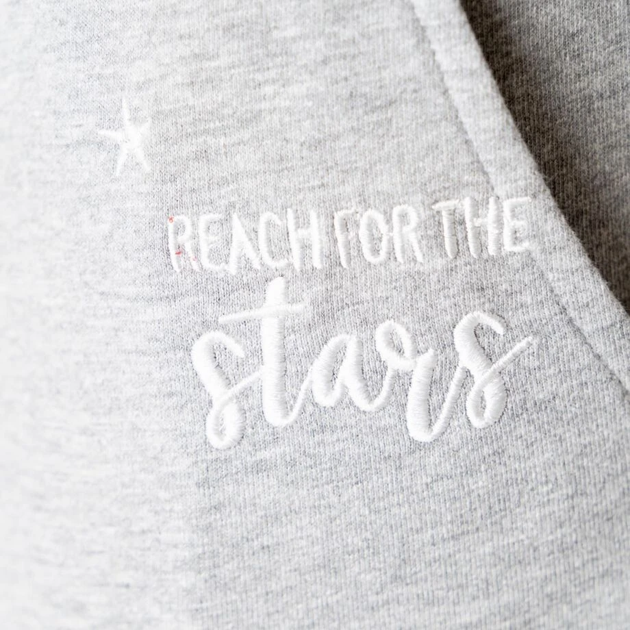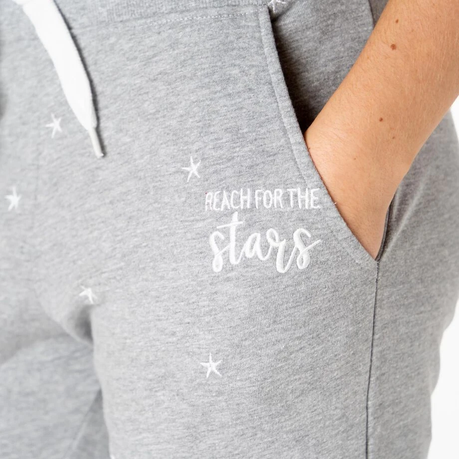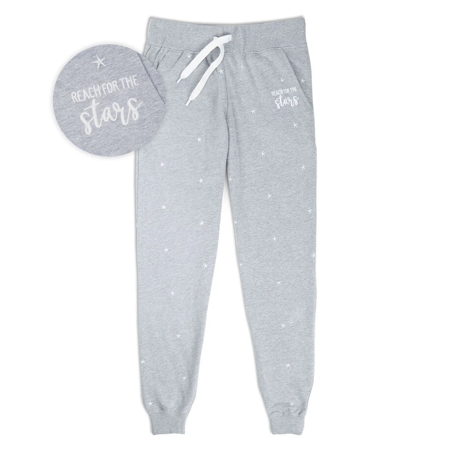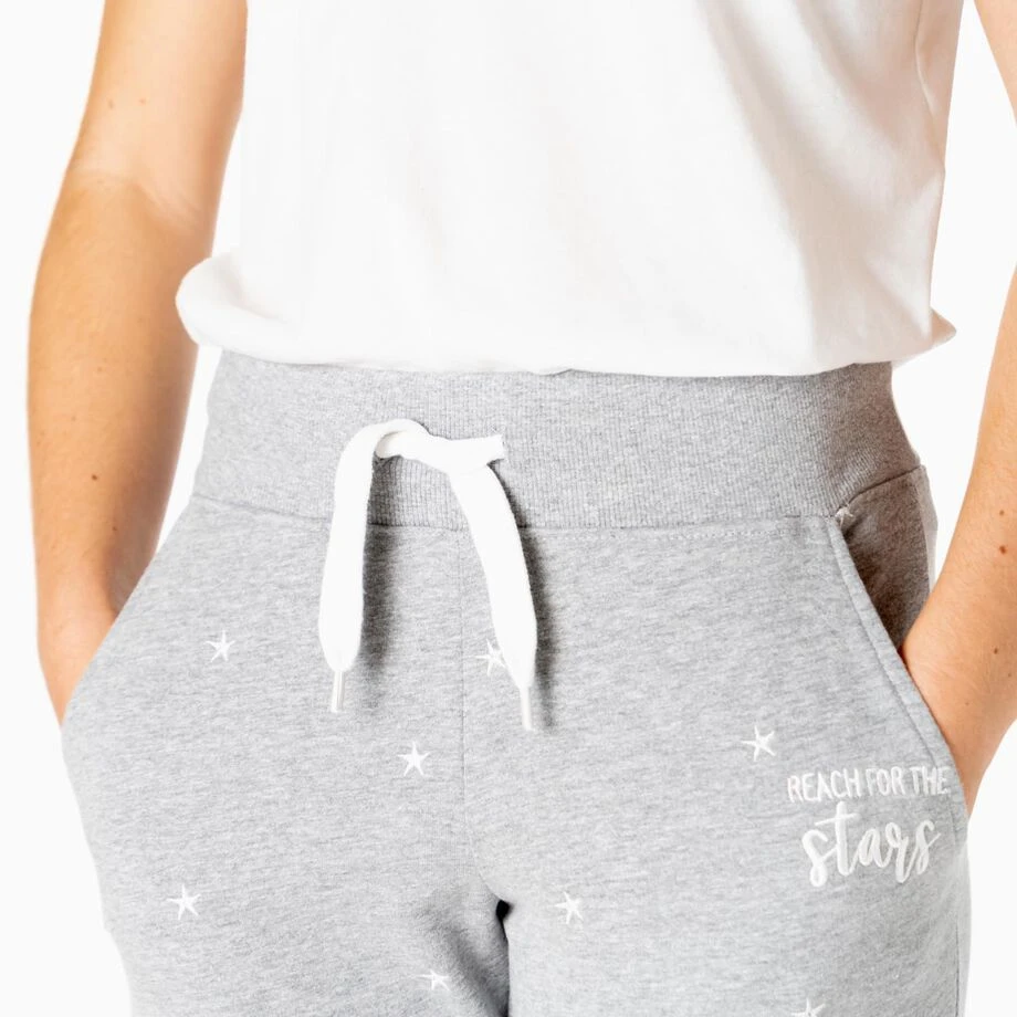 Comfort and basics are a necessity in every athlete’s wardrobe. The soft cotton joggers are perfect for workouts, daily errands, or lounging. Designed with functionality in mind, these super comfortable joggers offer an adjustable drawstring waist for custom fit and side pockets to hold your essentials. Furthermore, the joggers feature unique embroidery details: an all-over star pattern along with “Reach For the Stars” message for extra motivation.