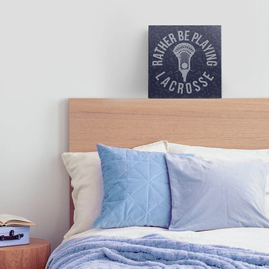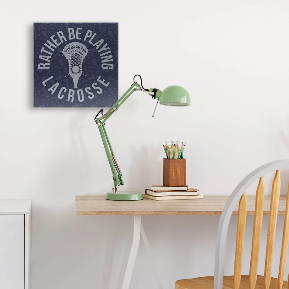 Add a lacrosse accent to any room you decorate with our one-of-a-kind I’d Rather Be Playing Lacrosse canvas. This 12″ X 12″ wall art features an exclusive design and artist-grade wrapped edges to complete the look. Bring your passion for the game to life with the texture and depth of this unique stretched canvas art. Perfect to create a sports themed room and a thoughtful gift for any lacrosse player or fan. Hardware included for easy hanging.
