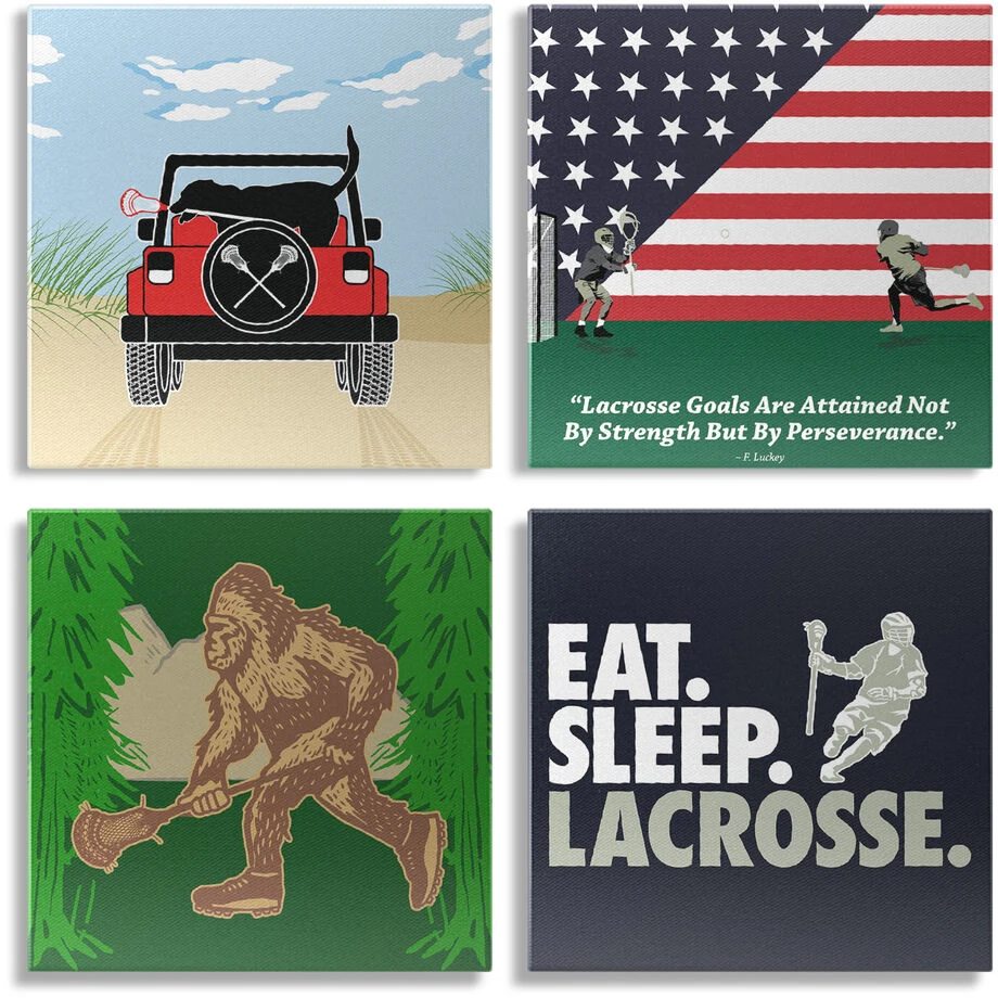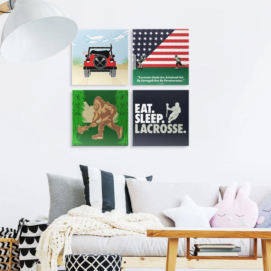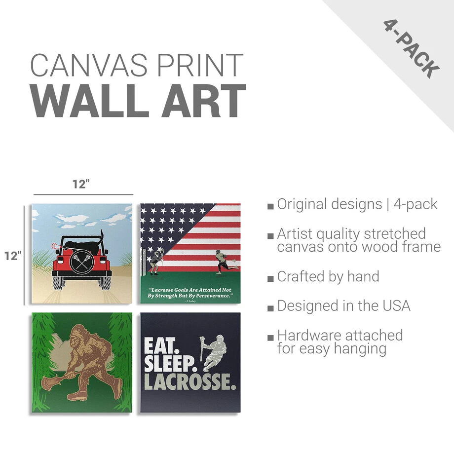 Add a lacrosse accent to any room you decorate with our one-of-a-kind Lacrosse Life 4-piece canvas set. Each wall art measures 12″ X 12″ and features an exclusive design and artist-grade wrapped edges to complete the look. Bring your passion for the game to life with the texture and depth of this unique stretched canvas prints. Perfect to create a sports themed room and a thoughtful gift for any lacrosse player or fan. Hardware included for easy hanging.