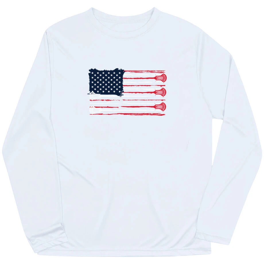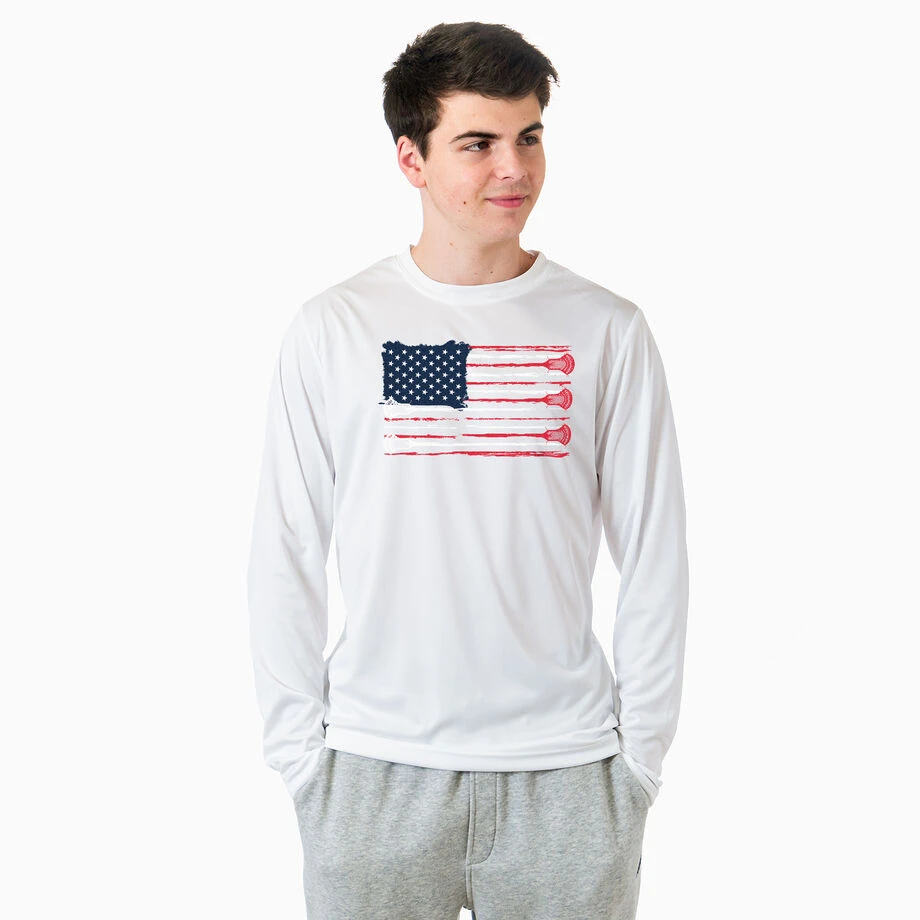 Gear up for a game, practice or any activity with our long sleeve tech tee with a lacrosse design, this is the perfect tee to show off that lacrosse pride. This moisture-wicking long sleeve athletic tech tee is great way to keep you dry during all activities or daily wear. With UV protection it will be sure to protect your skin as well. This shirt also makes for a great gift for any occasion.