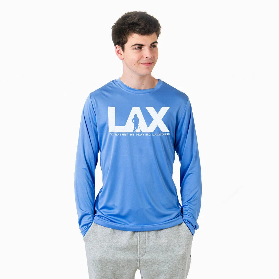 Rep your lacrosse love in this I’d Rather LAX design! This long sleeve performance tee is made from 100% moisture-wicking polyester interlock to keep athletes cool and dry. With a relaxed and easy fit, this tech tee is UV protected and a great way to keep you comfortable while being able to show off your love for your favorite sport. If you are looking to add a personalized touch, each design has the option to add your team number to the back. This lacrosse shirt is the athletic long sleeve you will want to add to your wardrobe, and also makes for a perfect gift idea for any occasion.