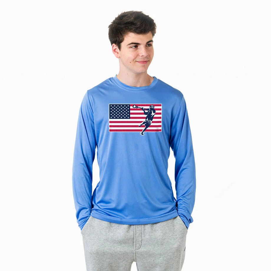 Rep your love for the sport and the red, white and blue in this Patriotic Lacrosse design. Perfect for 4th of July! This long sleeve performance tee is made from 100% moisture-wicking polyester interlock to keep athletes cool and dry. With a relaxed and easy fit, this tech tee is UV protected and a great way to keep you comfortable while being able to show off your love for your favorite sport. If you are looking to add a personalized touch, each design has the option to add your team number to the back. This lacrosse shirt is the athletic long sleeve you will want to add to your wardrobe, and also makes for a perfect gift idea for any occasion.