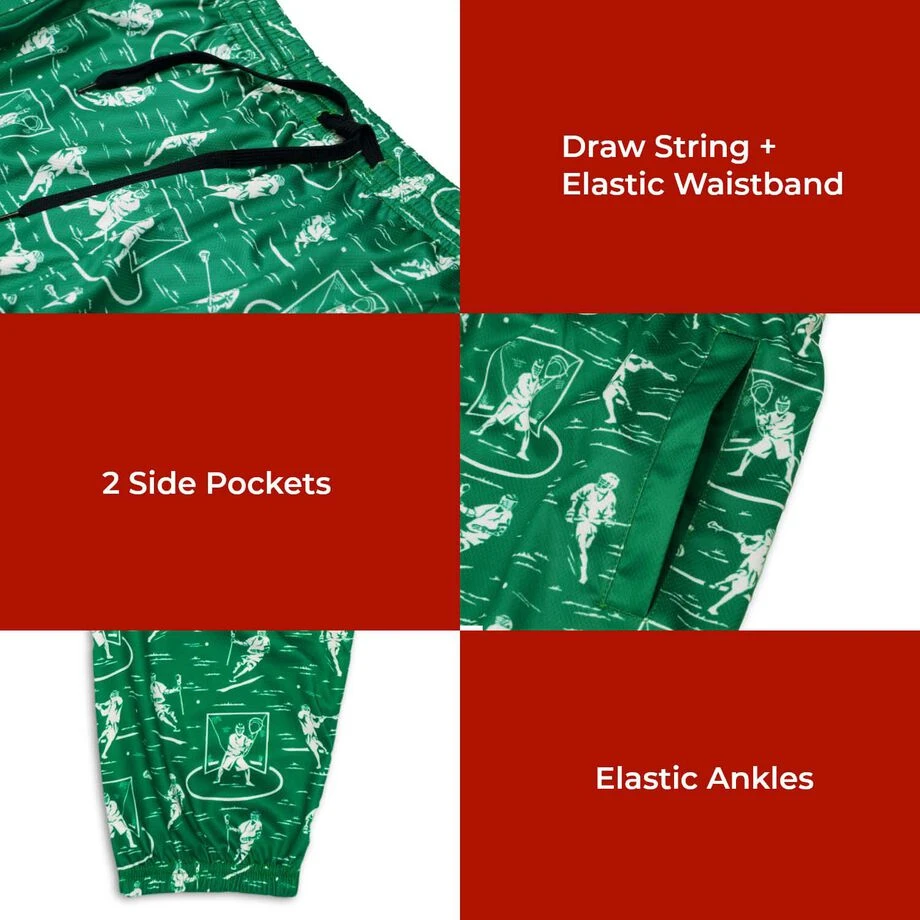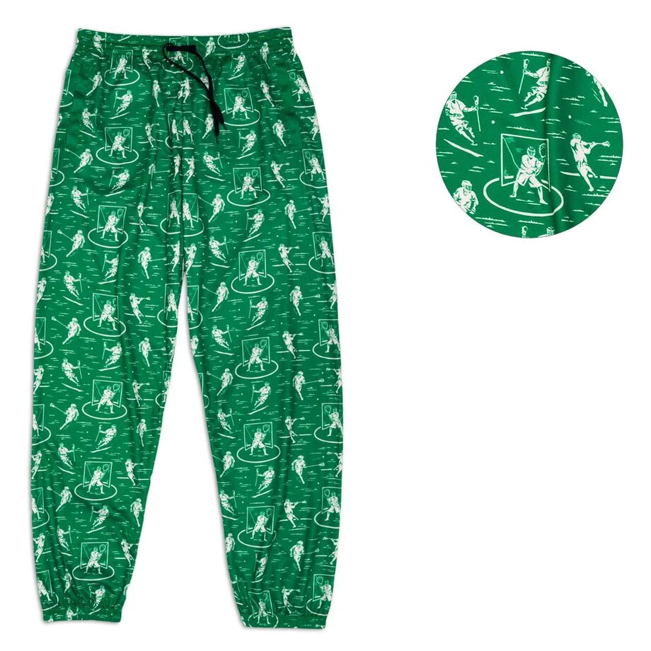 Get comfy in a pair of our lacrosse lounge pants with a fun action player design, whether at home or the field these lounge pants are sure to be a hit for all occasions. These lounge pants are made from 100% performance polyester, which makes them great to wear year round. Our lounge pants also feature a comfortable elastic waistband with a drawstring, along with side pockets and elastic ankles. A pair of these lounge pants make for a great gift for any occasion.