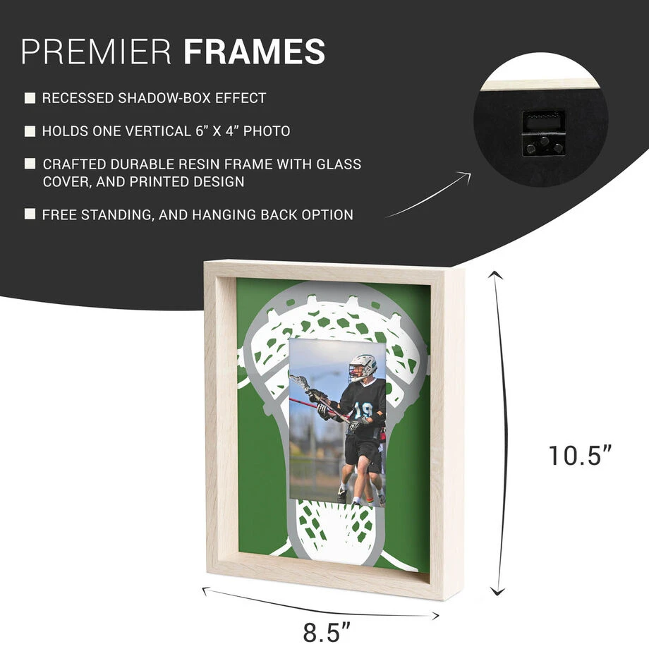 Our Premier Guys Lacrosse Frame features a unique high quality printed lacrosse stick design on glass, that compliments any photo, making it the perfect gift for every occasion. This 10 1/2″ x 8 1/2″ frame can capture that one treasured moment in a 4″ x 6″ photo. Best of all, you can showcase your frame like a shadow box by displaying it on a table or hanging it on a wall. This frame exemplifies all the beauty having a glass cover, with a durable wood-like resin texture. Admire your love of the game with this one of a kind frame, truly the best gift you can give to the laxer in your life.