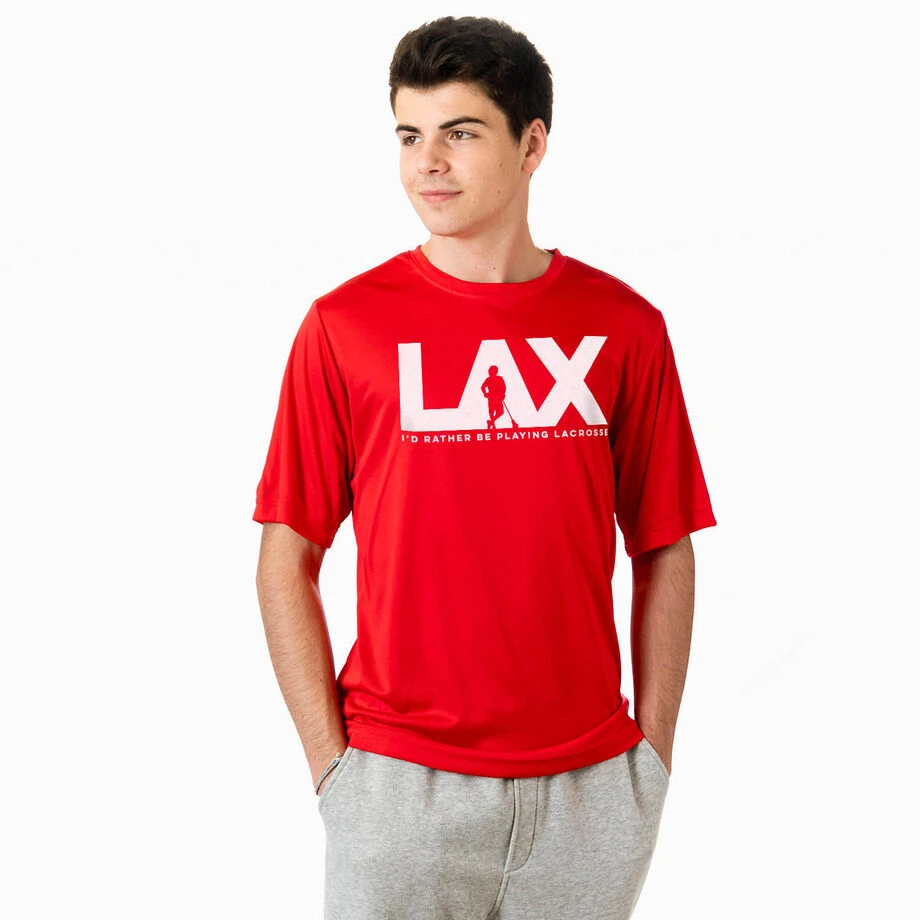 Rep your lacrosse lifestyle in this I’d Rather LAX tee. Designed to perform, our short sleeve performance t-shirts are made from 100% moisture-wicking polyester interlock with UV protection to keep athletes cool and dry. With a relaxed and easy fit, they make for a great tee for both on and off the lacrosse field. Personalize these tees by adding your team number to the back. These make for a winning gift idea for any occasion for both players and fans!