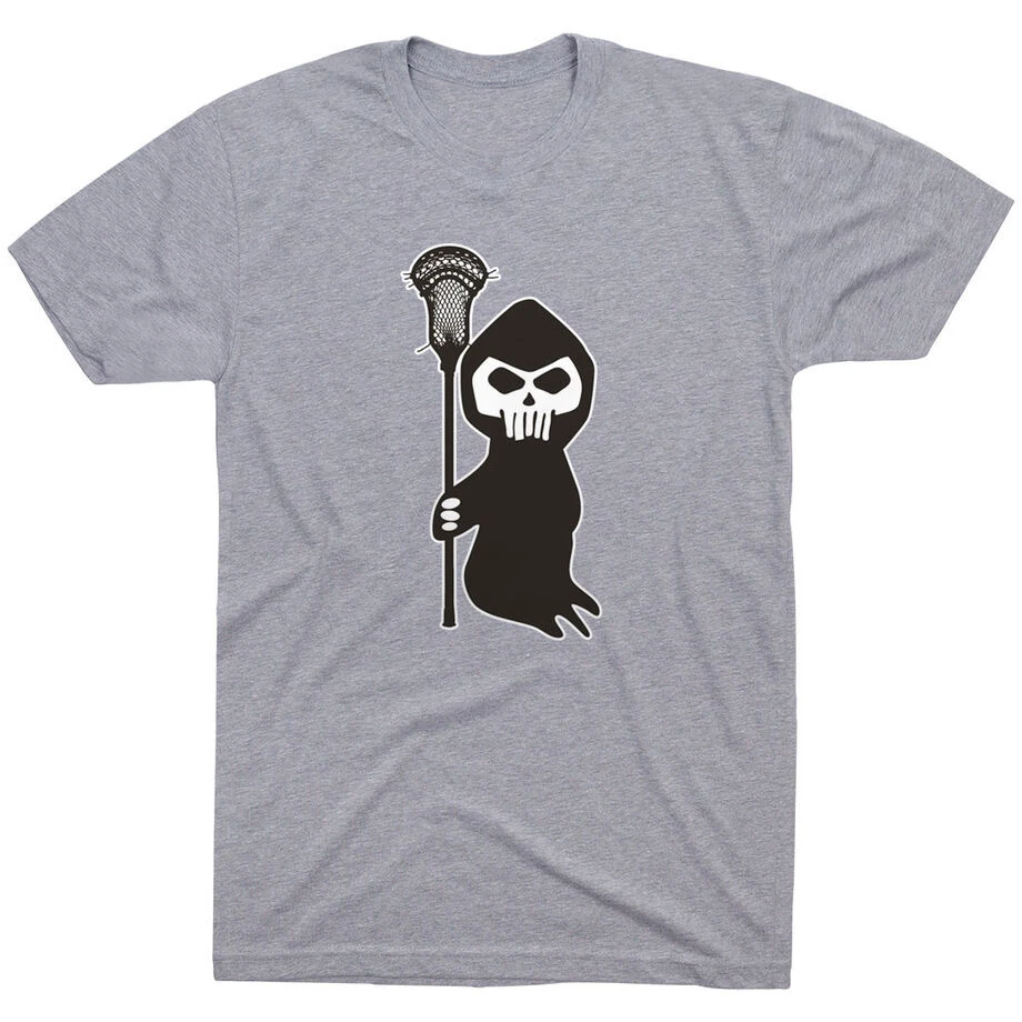 Our short sleeve guys lacrosse T-Shirt features an exclusive lacrosse reaper design that’s sure to be a favorite all year round and a great lacrosse gift. The lightweight and soft T-Shirt is perfect for Halloween, but will look great both on and off the field all year round. Proud players will love to receive this unique lacrosse gift at the end of the season, for a holiday (including Halloween), a birthday, or any special occasion.