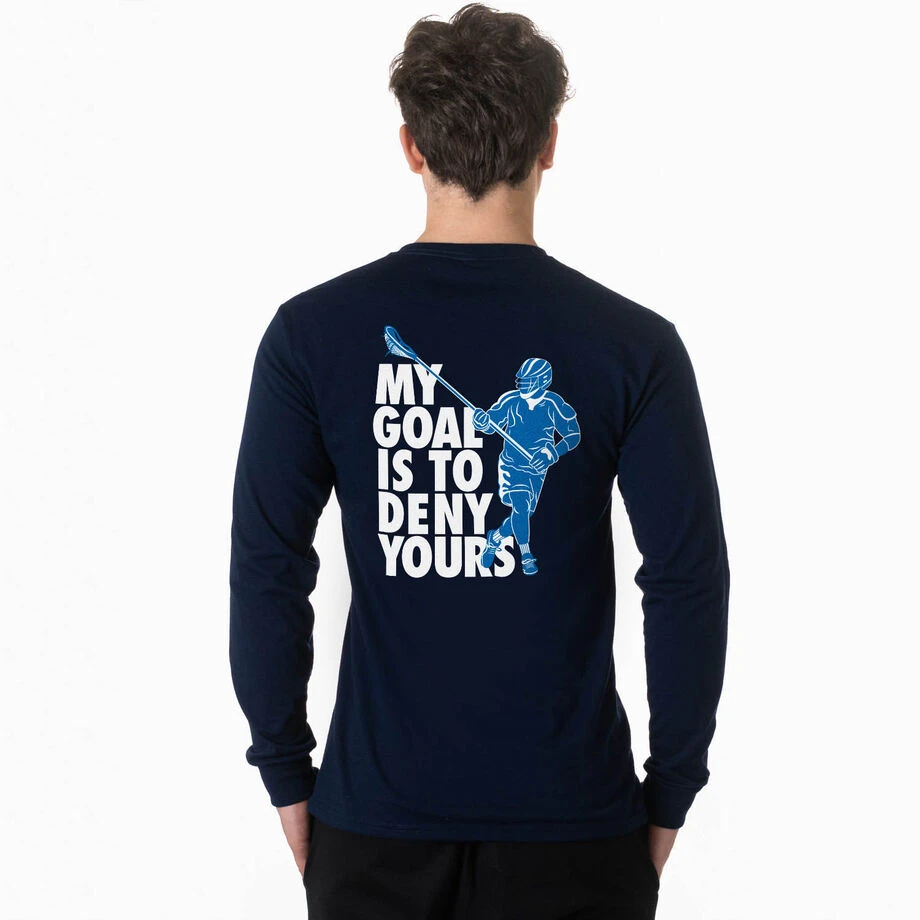 Show off your love for guys lacrosse with our exclusive Back Design Long Sleeve Shirts. These stylish shirts feature our exclusive “My Goal Is To Deny Yours Defenseman” design on the back, allowing you to express your passion for the sport in a fashionable way. Meticulously crafted with sharp attention to detail, each shirt boasts a guys lacrosse design that is sure to turn heads. Whether you’re a dedicated fan, an avid player, or simply admire the spirit of guys lacrosse, this shirt is the perfect choice to make a bold statement wherever you go. Available in a variety of colors and unique designs, these shirts are a must-have for any athlete’s wardrobe.