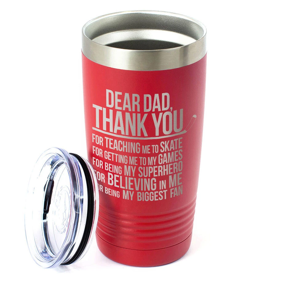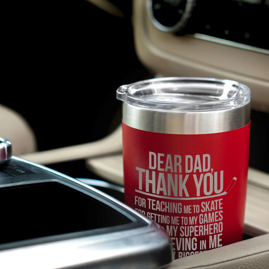 Thank your dad with exclusive hockey engraved stainless steel travel tumbler ideal for hot and cold drinks and a great gift he’ll proudly show off. The 20 oz. tumbler uses double-wall vacuum insulation to ensure hot drinks stay hot and cold drinks stay cold for an extended period of time. Dad will love the durable and stylish travel tumbler that’s a great gift for Father’s Day and other holidays, as well as to say thanks for all his time and support at the end of the season.
