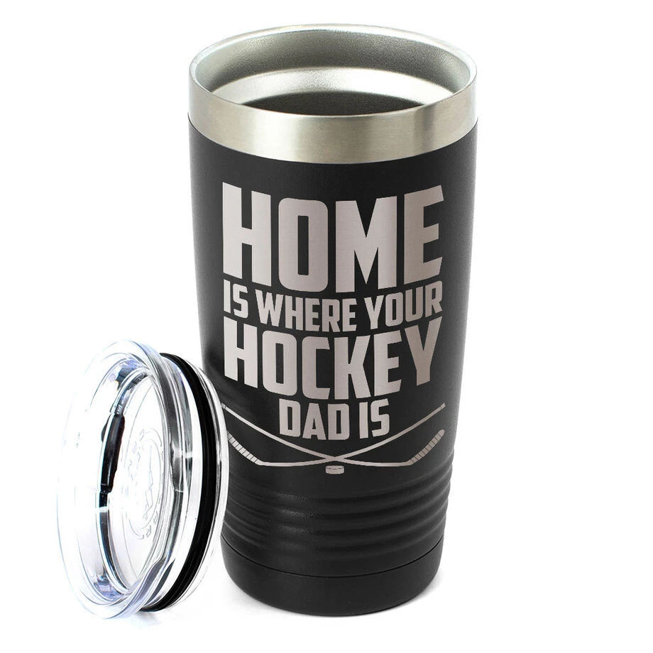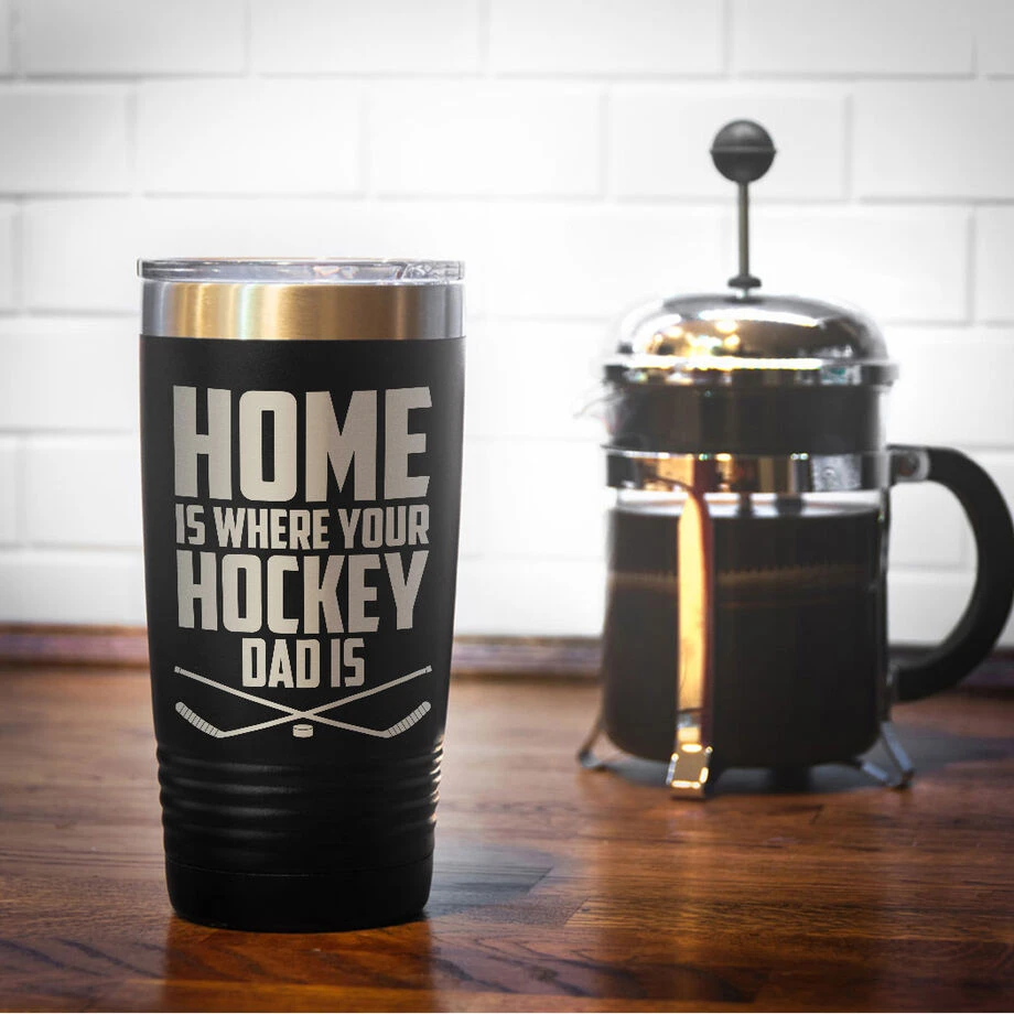Show your dad how much you appreciate all that he does with this unique hockey dad travel mug, this mug is sure to a favorite for coffee on the go. Our 20 oz. hot/cold insulated tumbler is the perfect choice for coffee – or any beverage – and keeps them near optimal temperatures for as long as possible. Utilizing double-wall vacuum insulation, the tumbler ensures hot drinks stay hot and cold drinks stay cold for as long as possible. Laser engraved with a bold design, this tumbler is great gift for that special someone that is sure to be put to good use almost every day.