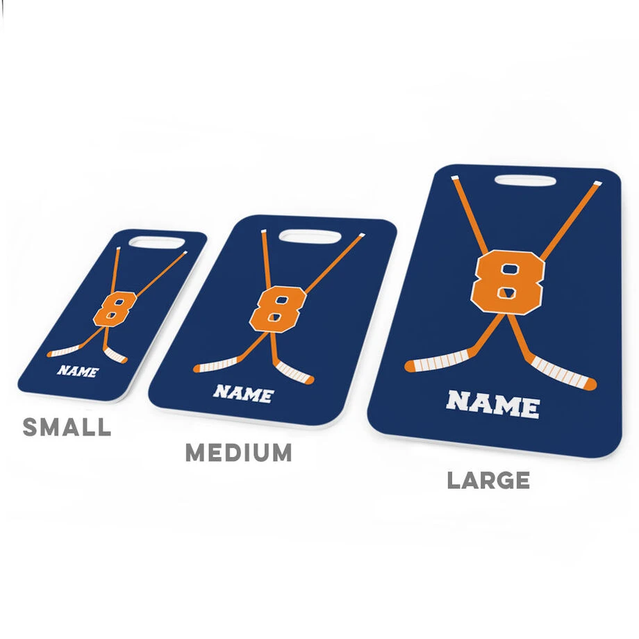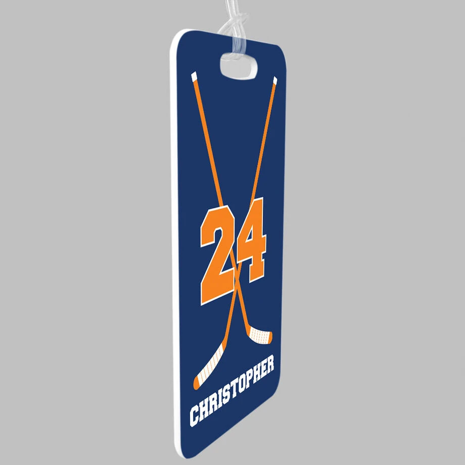 Any player will love this sturdy plastic hockey bag tag with a crossed sticks design that is personalized with his name and number. Available in three sizes, it can be used on a backpack, equipment bag or luggage, and the flexible hanging loop makes it easy to switch from one to another as needed. For identification when traveling, there is an option to have his contact information printed on the reverse. A great gift for your favorite player for any occasion, this hockey bag tag is ideal for every member on the team.