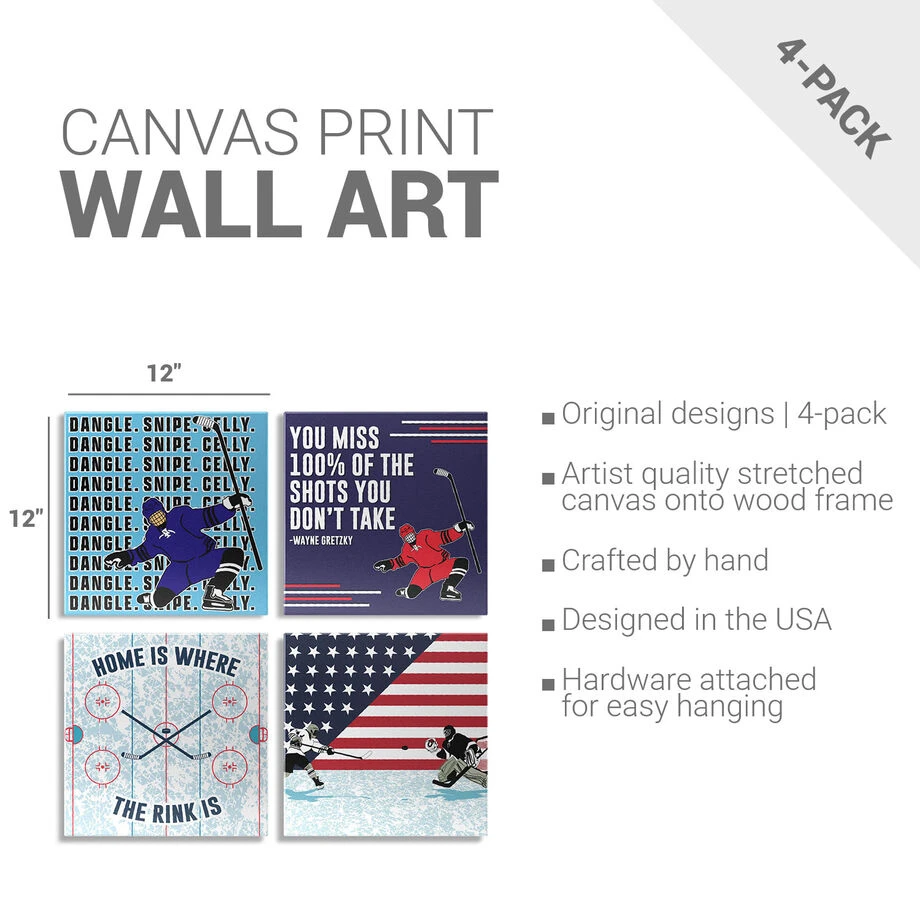 Add a hockey accent to any room you decorate with our one-of-a-kind Dangle Snipe Celly 4-piece canvas set. Each wall art measures 12″ X 12″ and features an exclusive design and artist-grade wrapped edges to complete the look. Bring your passion for the game to life with the texture and depth of this unique stretched canvas prints. Perfect to create a sports themed room and a thoughtful gift for any hockey player or fan. Hardware included for easy hanging.