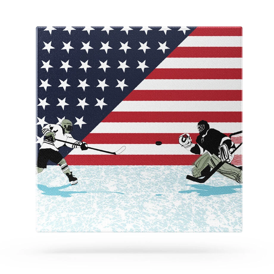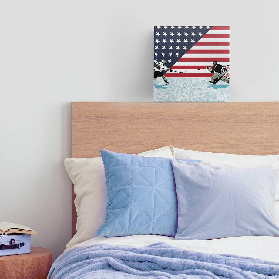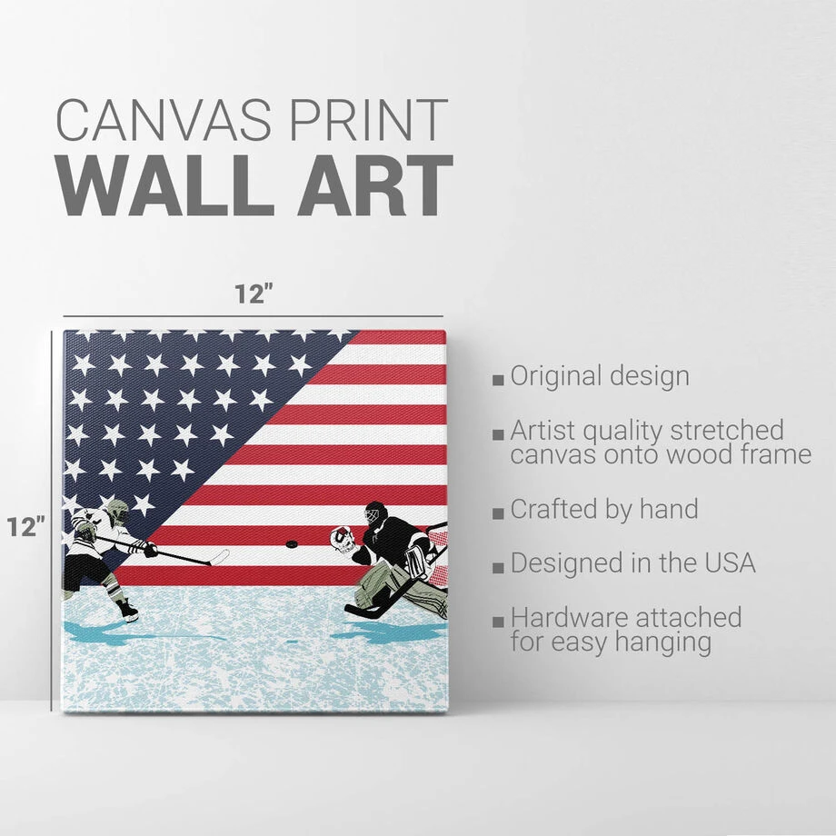 Add a hockey accent to any room you decorate with our one-of-a-kind Patriotic Hockey canvas. This 12″ X 12″ wall art features an exclusive design and artist-grade wrapped edges to complete the look. Bring your passion for the game to life with the texture and depth of this unique stretched canvas art. Perfect to create a sports themed room and a thoughtful gift for any hockey player or fan. Hardware included for easy hanging.