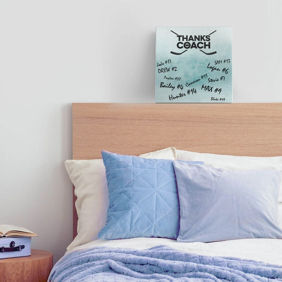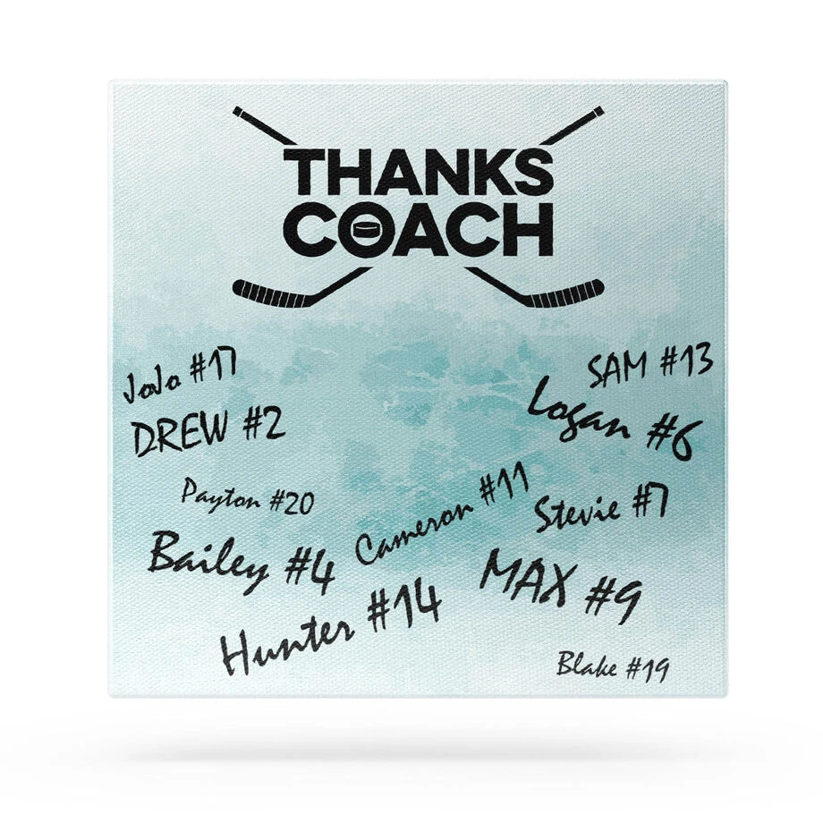 Give an memorable end of the season gift to your dedicated hockey coach this year with our Thanks Coach Hockey Canvas Wall Art. Write a heartfelt message or have the whole team sign to create a gift that will be cherished for years to come! This 12″ X 12″ fine wall art has an exclusive hockey design and artist-grade wrapped edges to complete the look. This canvas is the perfect way to create a gift of appreciation that will be a great sports themed accent in any room or office! Hardware included for easy hanging. Permanent marker sold separately.