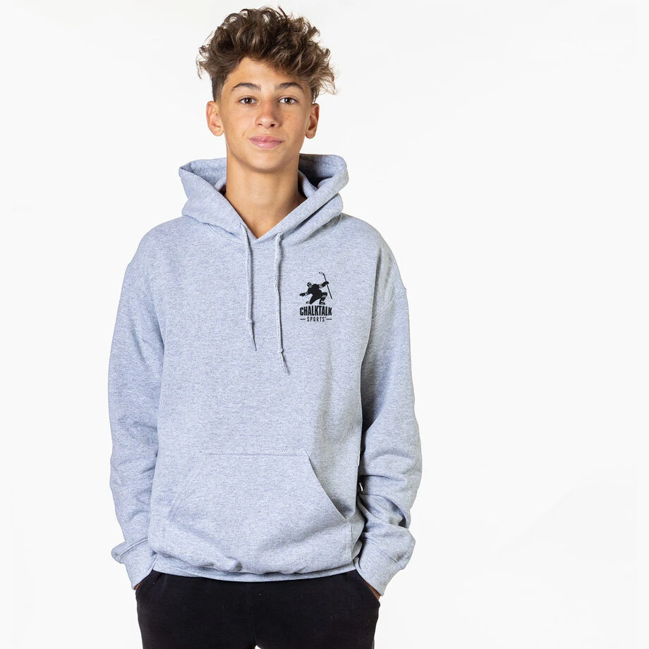 Wear your favorite hockey design on the BACK of your sweatshirt with a smaller design on the front. Ideal for hockey players, our pullover hooded sweatshirt is warm and comfortable, with our original artwork printed on the front and back. This sweatshirt is not only stylish and fun, it’s also designed from a blend of cotton and moisture-wicking polyester, making it the ideal hoodie for hockey players both on and off the ice. The double-lined hood can be pulled up for protection from the elements such as wind and rain, and the front pouch pocket is the perfect size for warming cold hands. A great gift for an individual player or the whole team at the end of the season, in addition to any special occasion. Coming in a variety of colors and unique designs these are a great wardrobe collection.