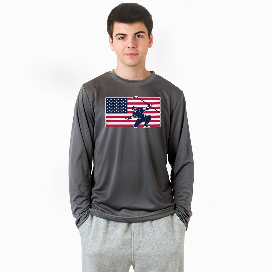 Our patriotic hockey design is perfect to show off the red, white and blue for 4th of July! This long sleeve performance tee is made from 100% moisture-wicking polyester interlock to keep athletes cool and dry. With a relaxed and easy fit, this tech tee is UV protected and a great way to keep you comfortable while being able to rep your favorite sport. If you are looking to add a personalized touch, each design has the option to add your team number to the back. This hockey shirt is the athletic tee you will want to add to your wardrobe, and also makes for a perfect gift idea for any occasion.