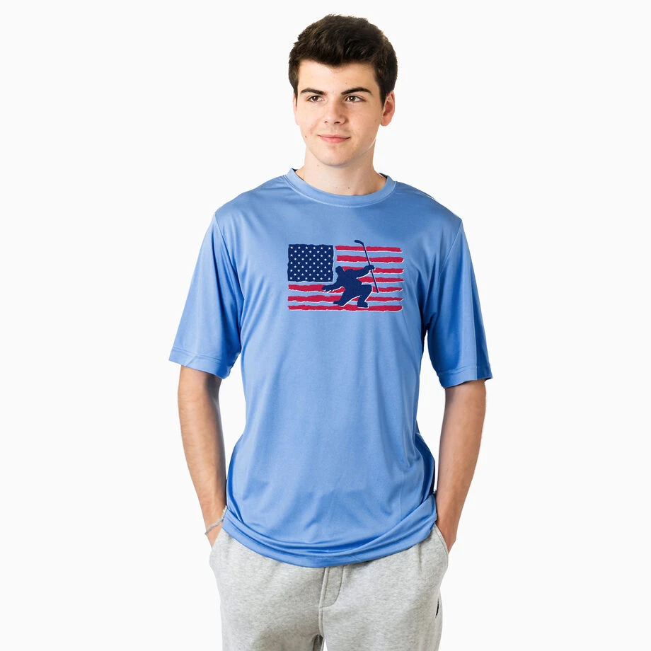 Gear up for a practice/game on or off the ice or any activity with our short sleeve tech tee with a unique hockey design, this is the perfect tee to show off that hockey pride. This moisture-wicking short sleeve tech tee is a great way to keep you dry during all activities or daily wear. With UV protection it will be sure to protect your skin as well. This shirt also makes for a great gift for any occasion.