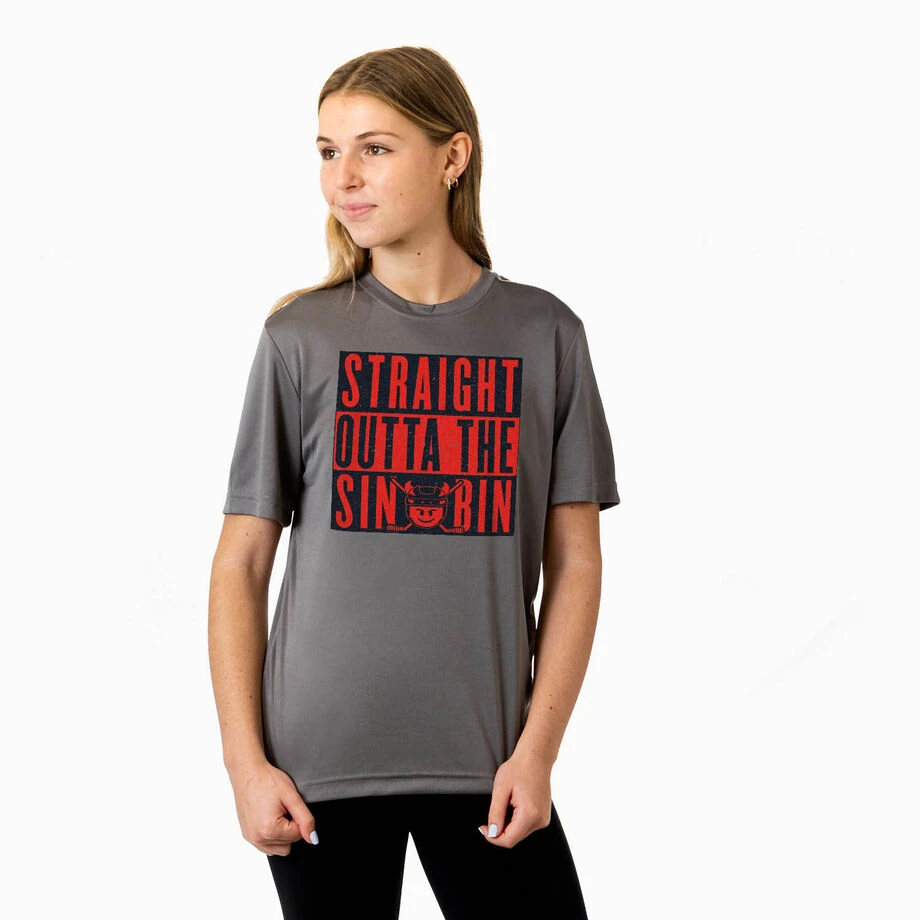 No penalties here with our Straight Outta the Sin Bin hockey tech tee! Designed to perform, our short sleeve performance t-shirts are made from 100% moisture-wicking polyester interlock with UV protection to keep athletes cool and dry. With a relaxed and easy fit, they make for a great tee for both on and off the ice. Choose from one of our many shirt colors so you can show off at the rink! These make for a winning gift idea for any occasion for both players and fans and perfect for Halloween! If you want to add a touch of personalization to our fun designs, you can add your team or favorite number to the back.