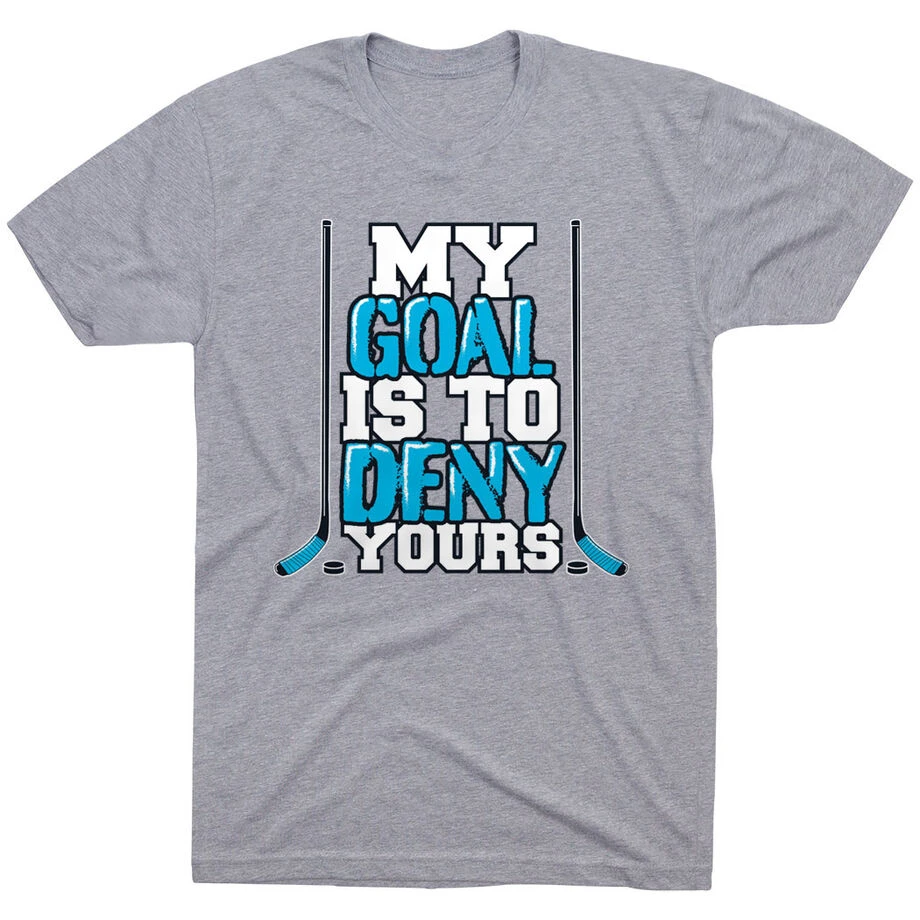 With a design featuring hockey sticks that look like goalposts this is one short sleeve hockey T-Shirt any hockey goalie will be proud to wear. When your one goal is to keep the other team from scoring, let them know what they’re up against… a goalie who will be denying goals left and right. A great end of the season gift that celebrates every goal denied in style.