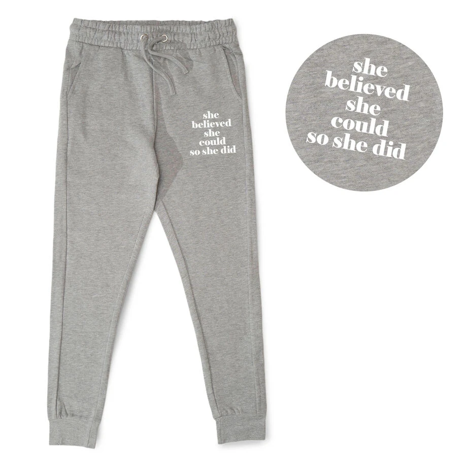 Comfort and basics are a necessity in every athlete’s wardrobe. The soft cotton joggers are perfect for workouts, daily errands, or lounging. Designed with functionality in mind, these super comfortable joggers offer an adjustable drawstring waist for custom fit, side pockets to hold your essentials, and an exclusive She Believed She Could So She Did design featured below the left side pocket for a true fashion statement.
