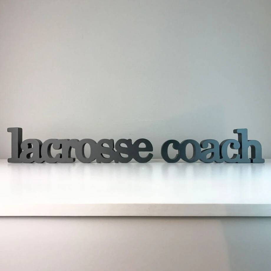 Have the whole team sign our lacrosse coach Wood Words for a one-of-a-kind end of the season lacrosse gift and keepsake that coach will love displaying for years to come. This unique gift ships with two black Wood Words – “lacrosse” and “coach”, as well as a silver permanent marker so the signatures will stand the test of time and serve as a special reminder of a great season and even greater team. The stylish Wood Words stand on any flat surface and can even be used as bookends, and are a gift that coach will love to receive and show off, whether at home or at the office.