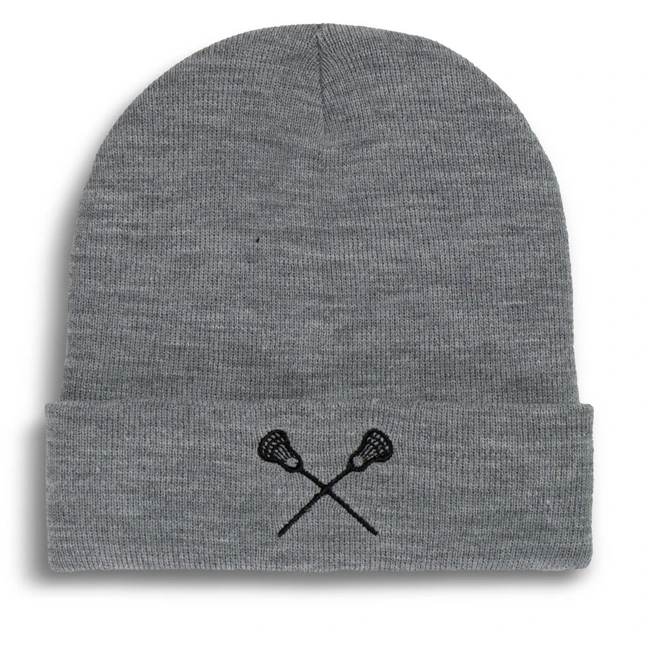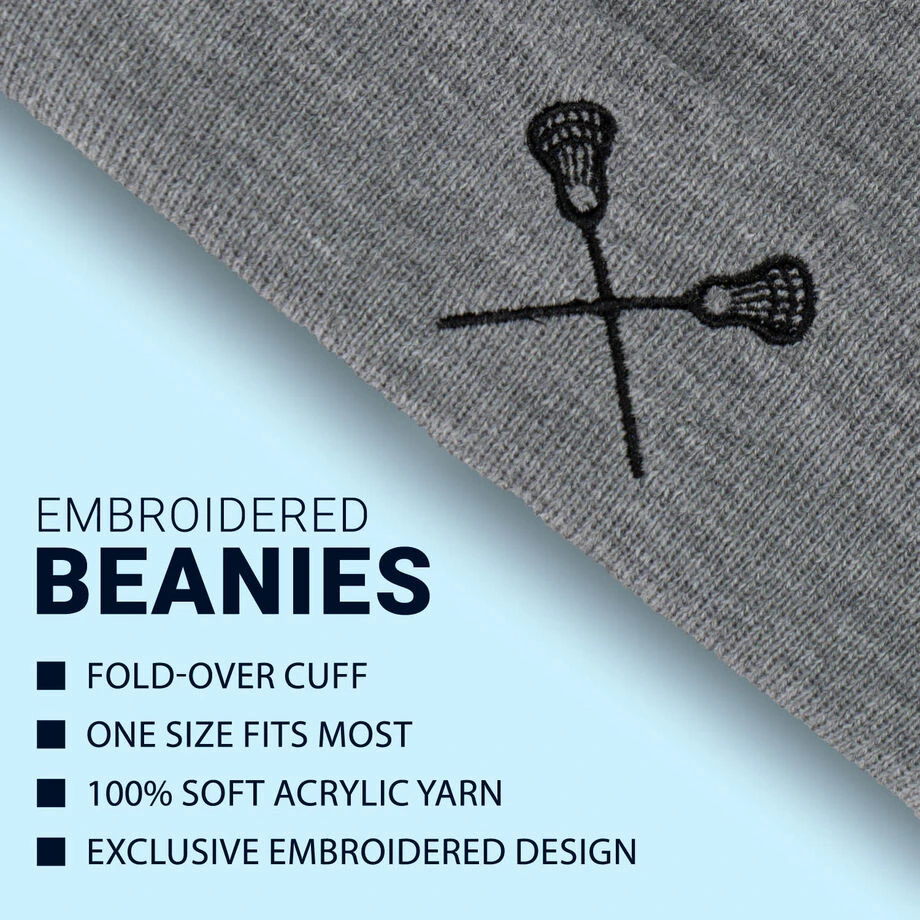Keep your head and ears warm on the coldest days in our “Lacrosse Sticks” embroidered beanie for lacrosse players and fans. This comfortable and cozy beanie features a fold-over cuff with an exclusive embroidered lacrosse design. Made from 100% acrylic yarn, the non-itch beanie is soft and warm. One size fits most. Wear this one-of-a-kind beanie to your games or while training during colder months. Perfect gift for any lacrosse player for any occasion.