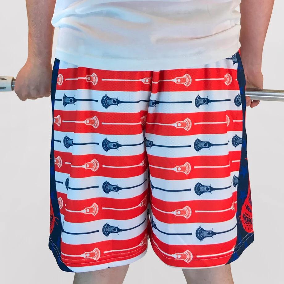 Show off your lacrosse pride in style with a pair of our stars & stripes lacrosse shorts, these shorts are sure to be a favorite with any player on and off the field. Our lacrosse shorts are ideal for year round wear, whether you are going to practice, game, lounging or daily wear. These lightweight incredibly comfortable shorts moisture-wicking shorts are also equipped with an elastic adjustable waistband and side pockets.