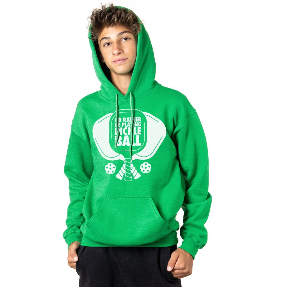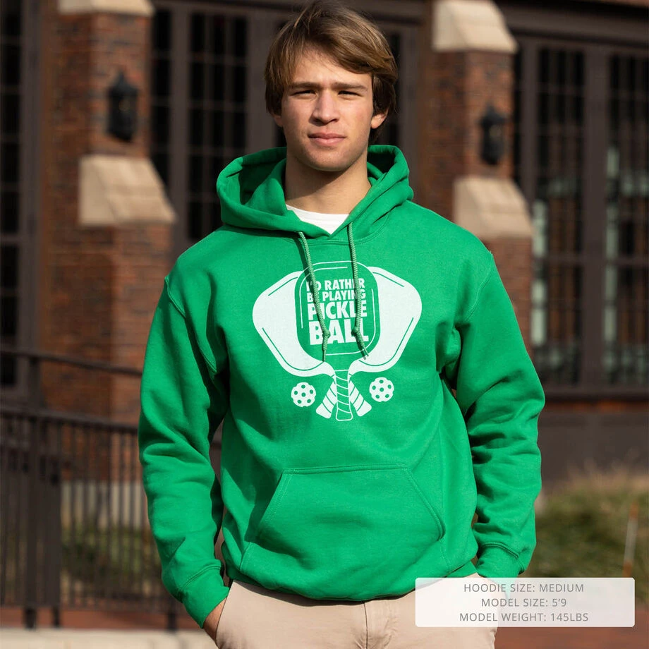Show off your pickleball pride in our hooded sweatshirt with our bold one-of-a-kind I’d rather be playing pickleball design, any player would love this as a gift for the holidays. This sweatshirt is not only stylish and fun, it’s also designed from a blend of cotton and moisture-wicking polyester, making it the ideal hoodie for players both on and off the court. The double-lined hood can be pulled up for protection from the elements such as wind and rain, and the front pouch pocket is the perfect size for warming cold hands. A great gift for an individual player/team at the end of the season, or for any special occasion.