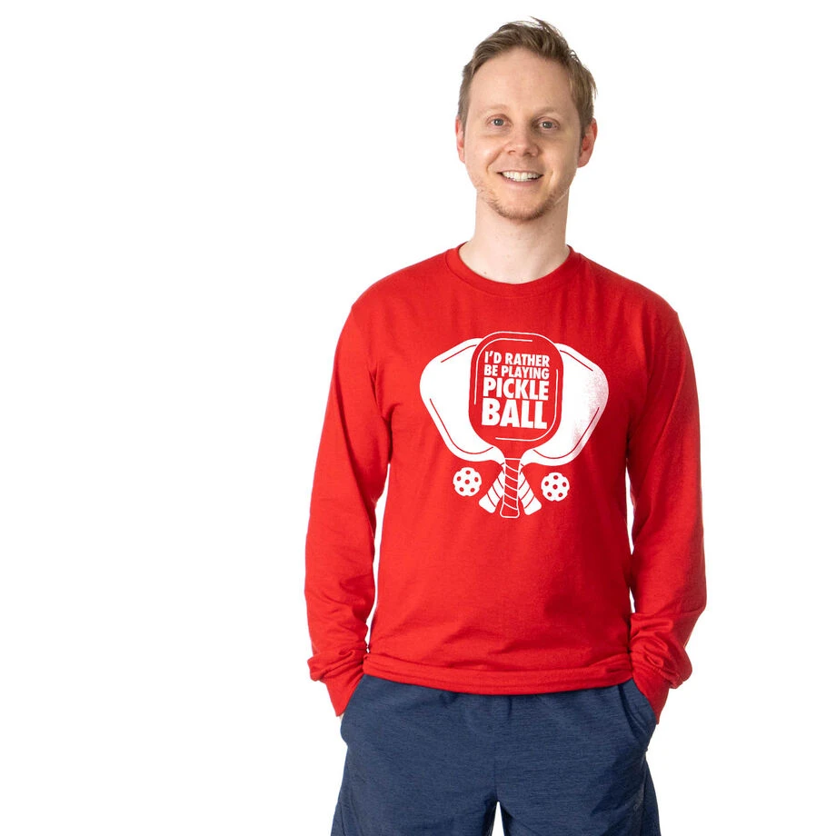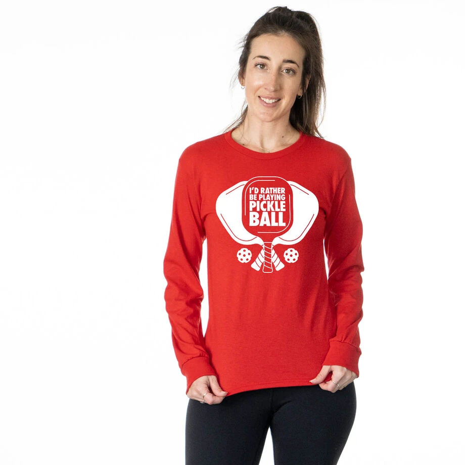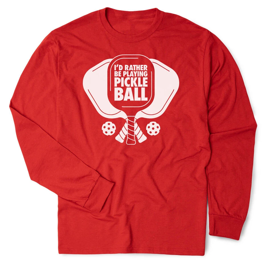 Show off your pickleball pride with this bold and stylized long sleeve I’d rather be playing pickleball shirt. It’s a great gift idea for anyone who just can’t get enough of that pickleball lifestyle. It makes for the perfect end of season gift or any special occasion. Coming in a variety of colors and designs these long sleeve shirts are a great wardrobe collection.