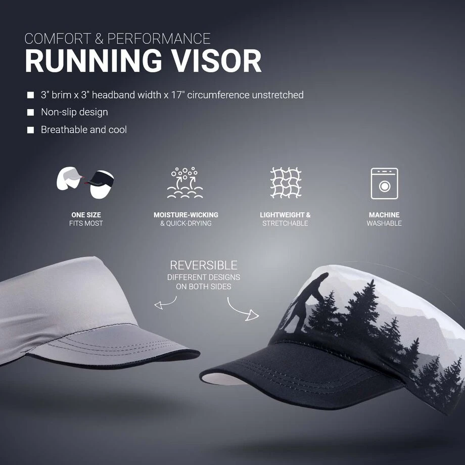 This lightweight visor is designed for athletes and outdoor enthusiast. Our performance visor features a wide brim and stretchable band for all-day comfort. The breathable and moisture-wicking material keeps you dry and cool during any activity. These foldable visors are also reversible, offering two unique designs in one! The design on one side features Big Foot, mountains, and trees and solid grey on the other. Keep the sun, hair, and sweat off your face while showing off your outdoorsy nature in our comfort performance visor.
