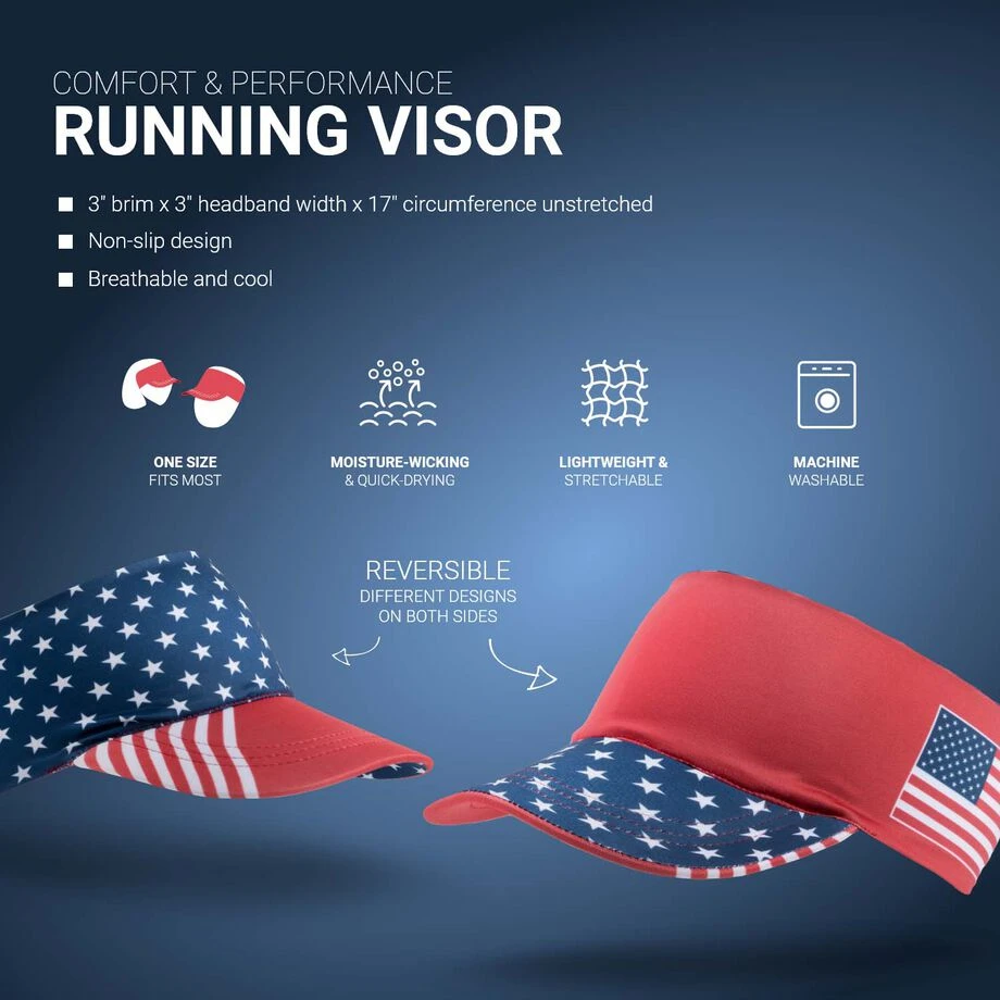This lightweight visor is ideal for a patriotic athlete. Our performance visor features a wide brim and stretchable band for all-day comfort. The breathable and moisture-wicking material keeps you dry and cool during any activity. These foldable visors are also reversible, offering two unique designs in one! The design on one side features all-over stars pattern with a solid red brim and the USA flag printed on solid red with all-over stars pattern on the brim on the other. Keep the sun, hair, and sweat off your face while showing off your patriotic pride in our comfort performance visor.