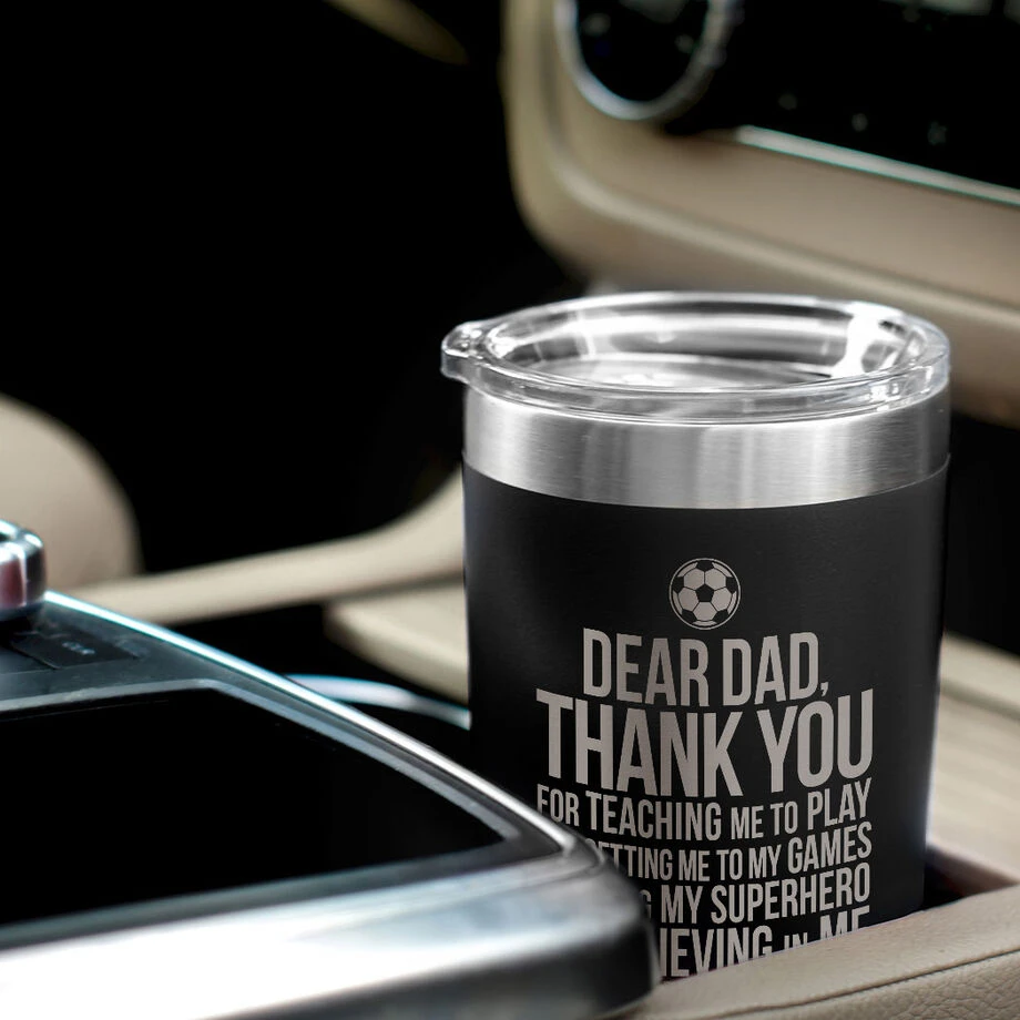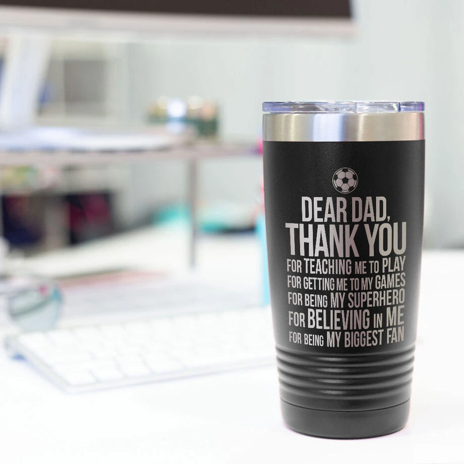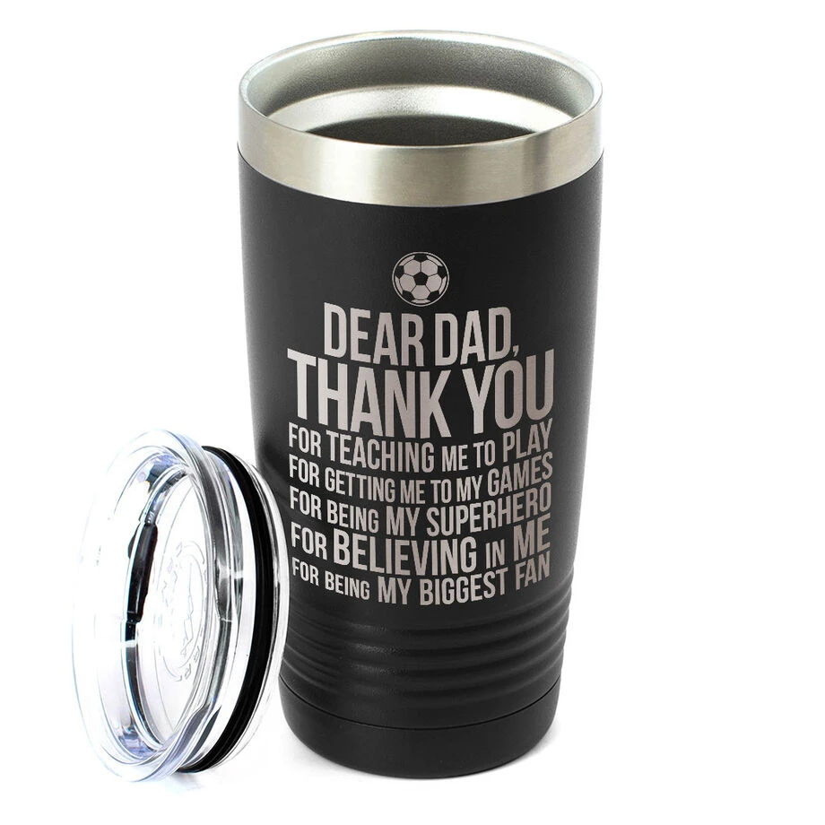 Thank your dad with exclusive soccer engraved stainless steel travel tumbler ideal for hot and cold drinks and a great gift he’ll proudly show off. The 20 oz. tumbler uses double-wall vacuum insulation to ensure hot drinks stay hot and cold drinks stay cold for an extended period of time. Dad will love the durable and stylish travel tumbler that’s a great gift for Father’s Day and other holidays, as well as to say thanks for all his time and support at the end of the season.