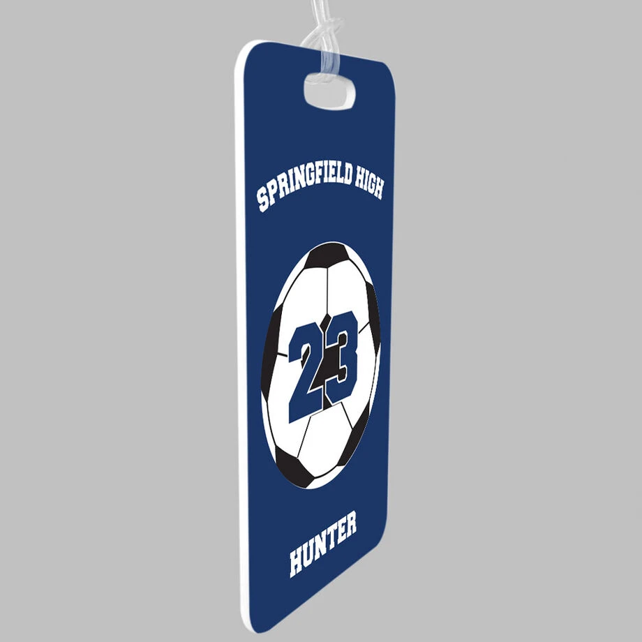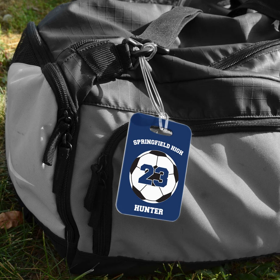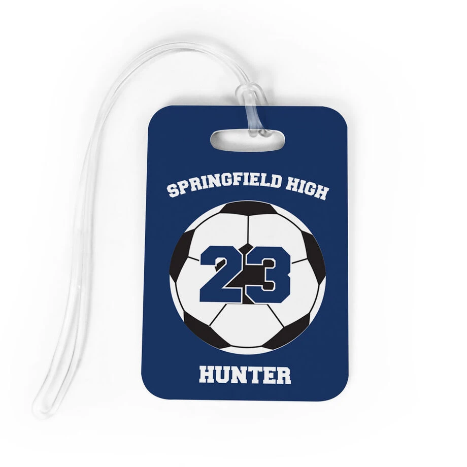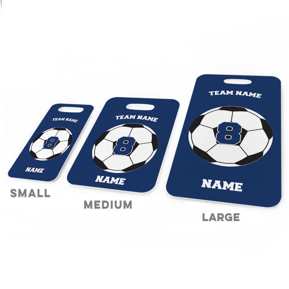 Fun and practical, our soccer bag tag is personalized with a team name, player name and a player number on an oversized ball design. Great to use everyday on a backpack or sport bag, it is fabricated from a rigid plastic and includes a flexible, clear loop that makes it quick and easy to transfer the tag from one bag to another as needed. Offered in three sizes and popular colors, this custom bag tag has optional printing on the back to include contact information – a necessity when used as a luggage tag. This soccer bag tag is the perfect team gift at the beginning, or to celebrate the end, of the season, or for your favorite player for any occasion.