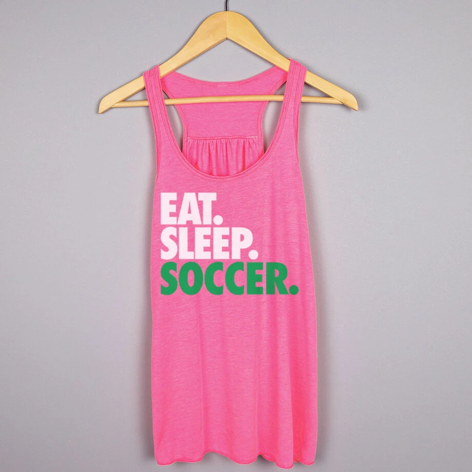 With a bold “Eat. Sleep. Soccer” design, our flowy soccer tank top is sure to be a favorite everyday tank top for a dedicated player and makes a great gift. Designed equally for comfort and style, the super soft and lightweight tank top is an ideal choice for the warm or hot weather, and it looks great, too. The cinched racerback tank top has a slight high/low cut that pairs perfectly with any bottoms of choice for a shirt that will be a go-to wardrobe staple for any spring and summer activities. Choose from a variety of colors for the perfect soccer gift for an individual player as well as the whole team to commemorate the end of the season, or any special occasion, including a birthday or holiday.