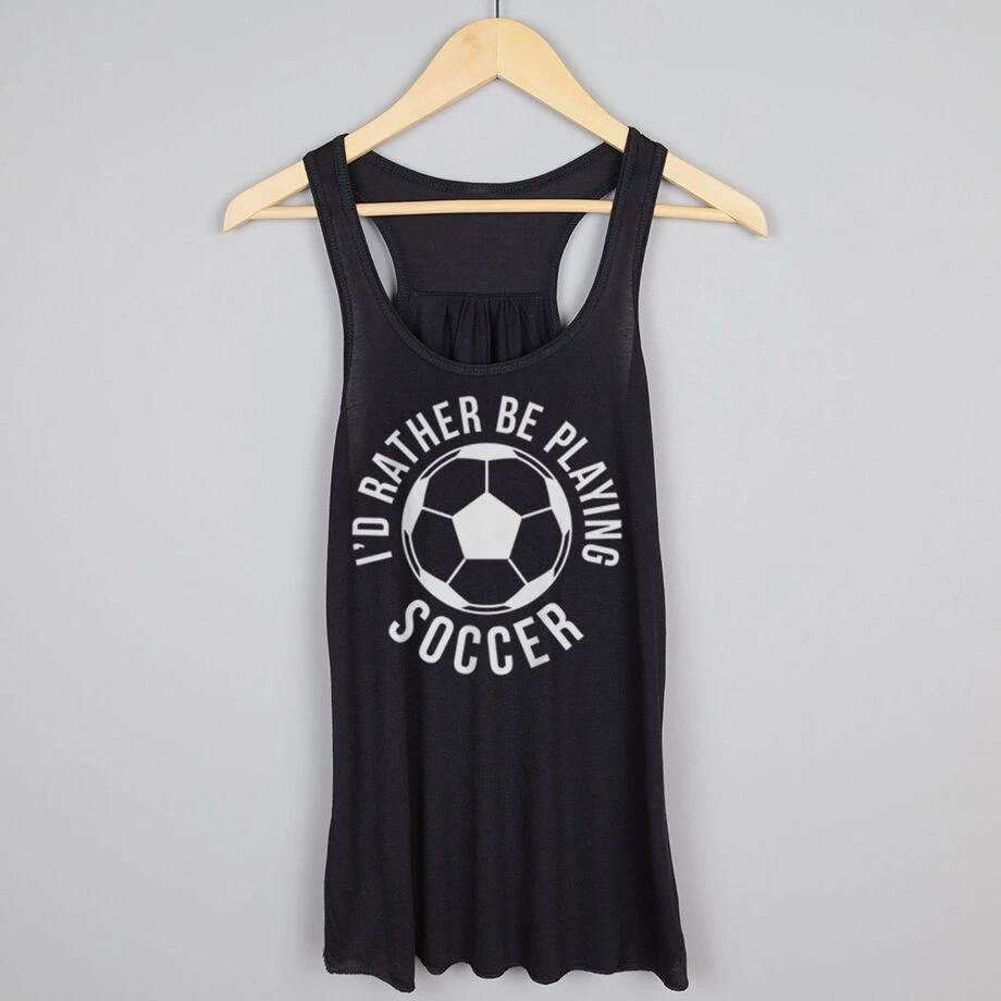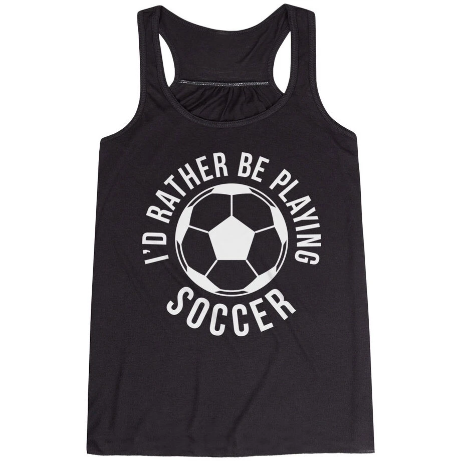 Show off your soccer pride in our flowy tank top with our bold I’d rather be playing soccer design, any player would love this as a gift for any occasion. Sure to be a go-to wardrobe staple when heading out for spring and summer activities, this is a comfortable flowy tank top that showcases a love for, and dedication to your sport. Available in a selection of colors, all with a slight high-low cut, the top looks great with shorts and leggings, or any bottoms of choice, and is sure to be a favorite.