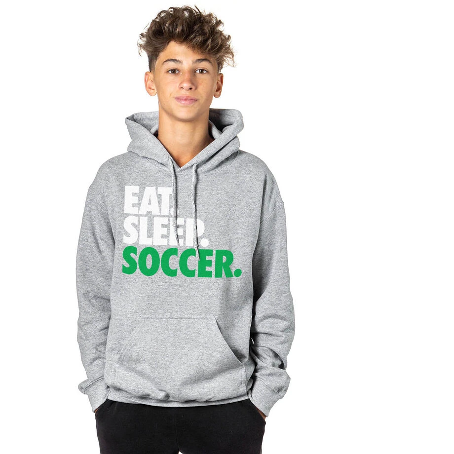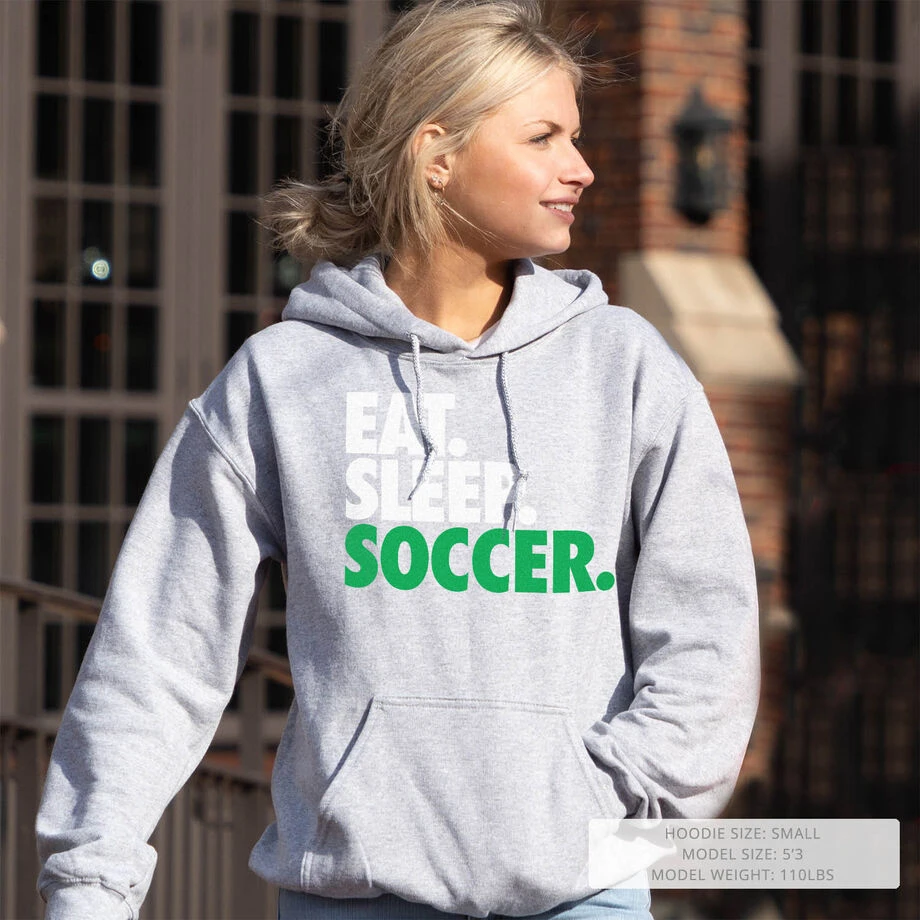Perfect on and off the field when the weather is cold, soccer players will love our Eat. Sleep. Soccer designed soccer hooded sweatshirt that’s a great gift for the whole team at the end of the season, or an individual player for any occasion. With a double-lined, drawstring hood and convenient front pouch pocket, this soccer hoodie is as stylish as it is practical. Designed from a blend of cotton and moisture-wicking polyester, it helps active players stay warmer and dry, for a more comfortable feeling when it’s cold out. Pull it on after a game to head home, or wear it as an everyday hoodie during the autumn and winter, no matter where you’re headed.