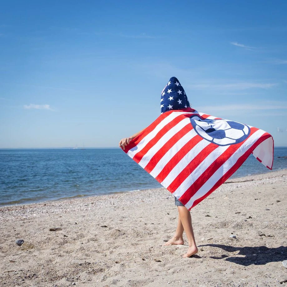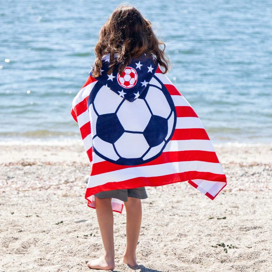 Whether you are on the beach, laying on the grass or watching a soccer game from the sidelines, stay comfortable and make a statement while sporting your eye-catching hooded beach towel. In fun colorful designs both kids and parents will love. This comfy, super absorbent beach towel is great for the home, to bring on a field, sunny days at the beach or lounging at the pool. Represent your love of soccer with this patriotic soccer flag design. Our towels are fun and functional! This hooded towel is designed to be super versatile by using it as a bathrobe after a dip in the water or can be placed over the car headrest to protect car seats from sand and water. It also folds up into a small triangle making it an easy grab and go to any destination. This is the ideal towel to rep your love for soccer on land or sea.
