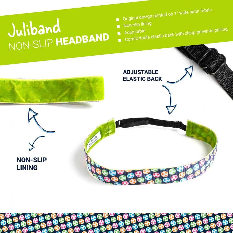 Our athletic headband features a unique soccer design. The comfortable Juliband headband is backed with a non-slip velvet to ensure your hair stays put through any activity. This headband is fully adjustable for the best custom fit. Our stylish and unique headband is perfect for any practice, game, or even everyday wear. This headband is an ideal accessory for every soccer player, or any other sport enthusiast.