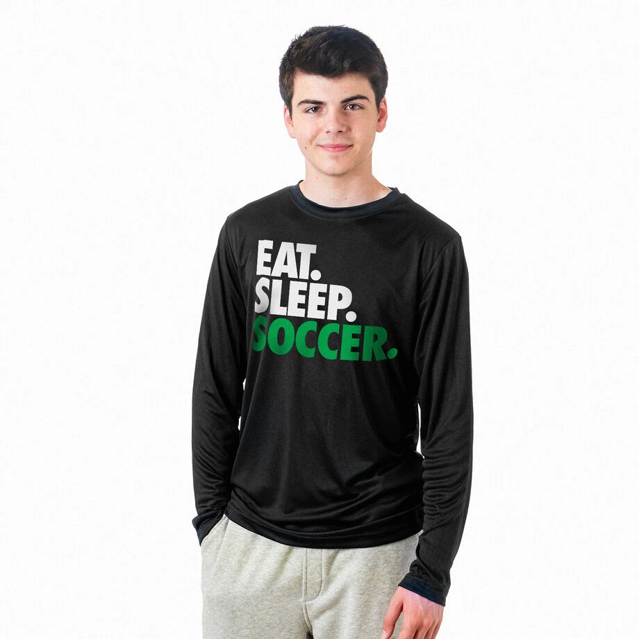Gear up for a game, practice or any activity with our long sleeve tech tee with a soccer design, this is the perfect tee to show off that soccer pride. This moisture-wicking long sleeve athletic tech tee is great way to keep you dry during all activities or daily wear. With UV protection it will be sure to protect your skin as well. This shirt also makes for a great gift for any occasion.