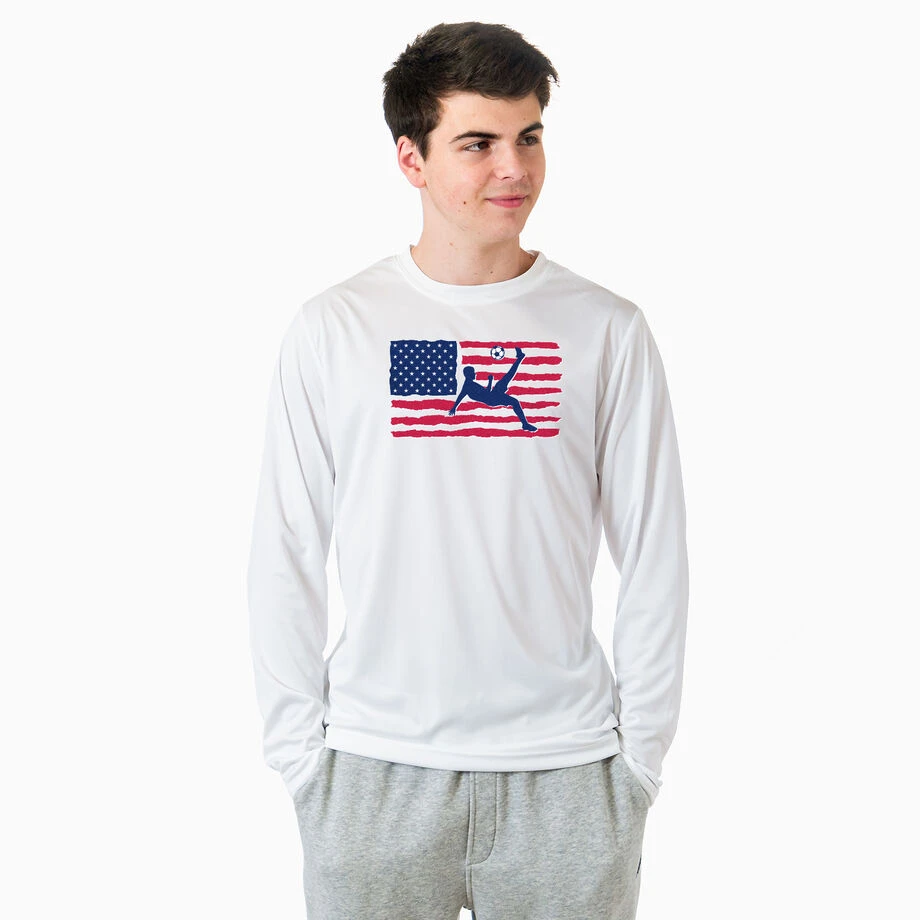 Gear up for a practice/game on or off the field, or any activity with our long sleeve tech tee with a unique soccer design, this is the perfect tee to show off that soccer pride. This moisture-wicking long sleeve athletic tech tee is a great way to keep you dry during all activities or daily wear. With UV protection it will be sure to protect your skin as well. This shirt also makes for a great gift for any occasion.