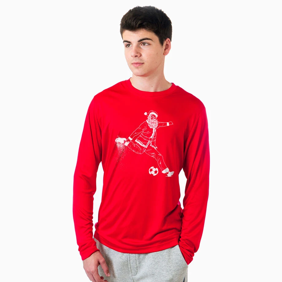 Gear up for a game, practice or any activity with our long sleeve tech tee with a soccer design, this is the perfect tee to show off that soccer pride. This moisture-wicking long sleeve athletic tech tee is great way to keep you dry during all activities or daily wear. With UV protection it will be sure to protect your skin as well. This shirt also makes for a great gift for any occasion.