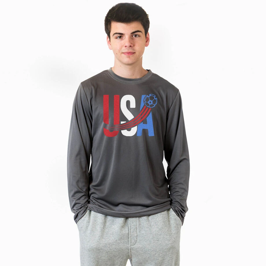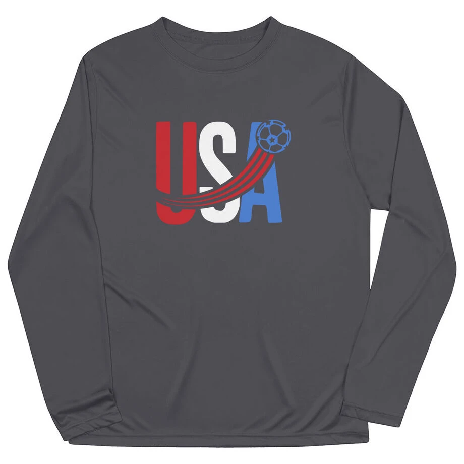 Rep that red, white and blue pride in our USA Patriotic soccer design, perfect for the 4th of July. This long sleeve performance tee is made from 100% moisture-wicking polyester interlock to keep athletes cool and dry. With a relaxed and easy fit, this tech tee is UV protected and a great way to keep you comfortable while being able to show off your love for your favorite sport. If you are looking to add a personalized touch, each design has the option to add your team number to the back. This soccer shirt is the athletic long sleeve you will want to add to your wardrobe, and also makes for a perfect gift idea for any occasion.