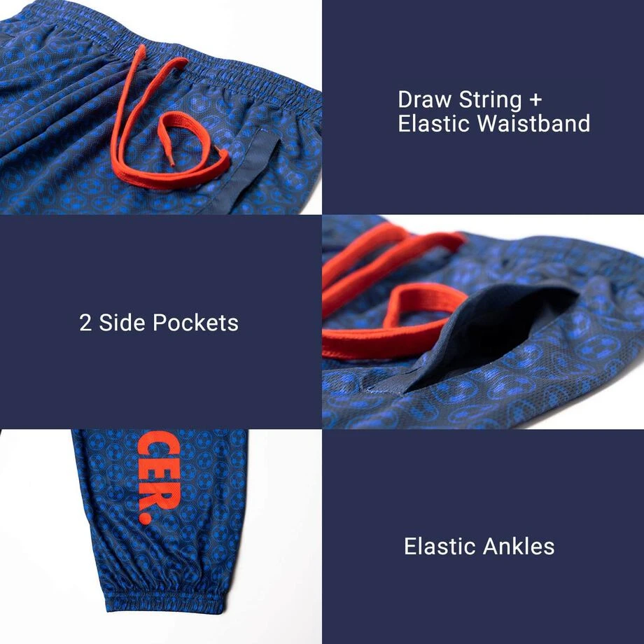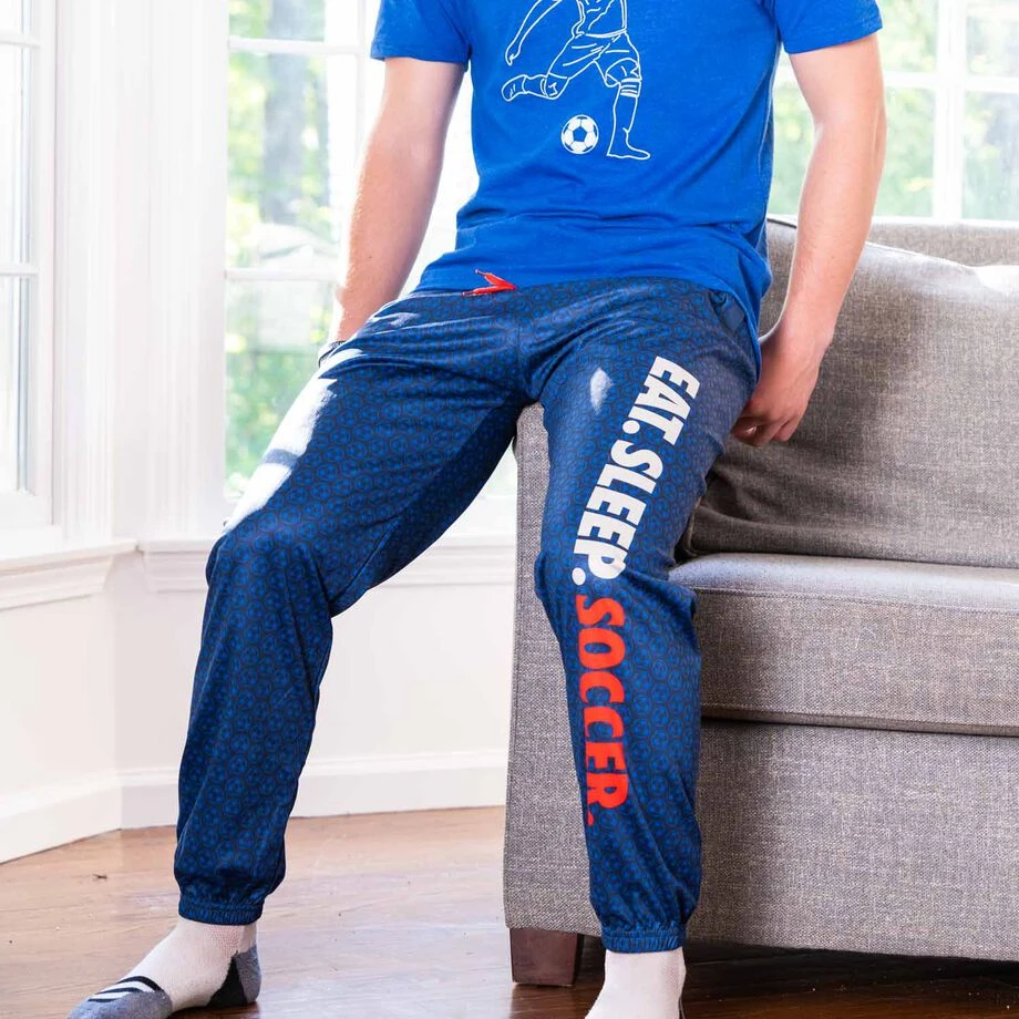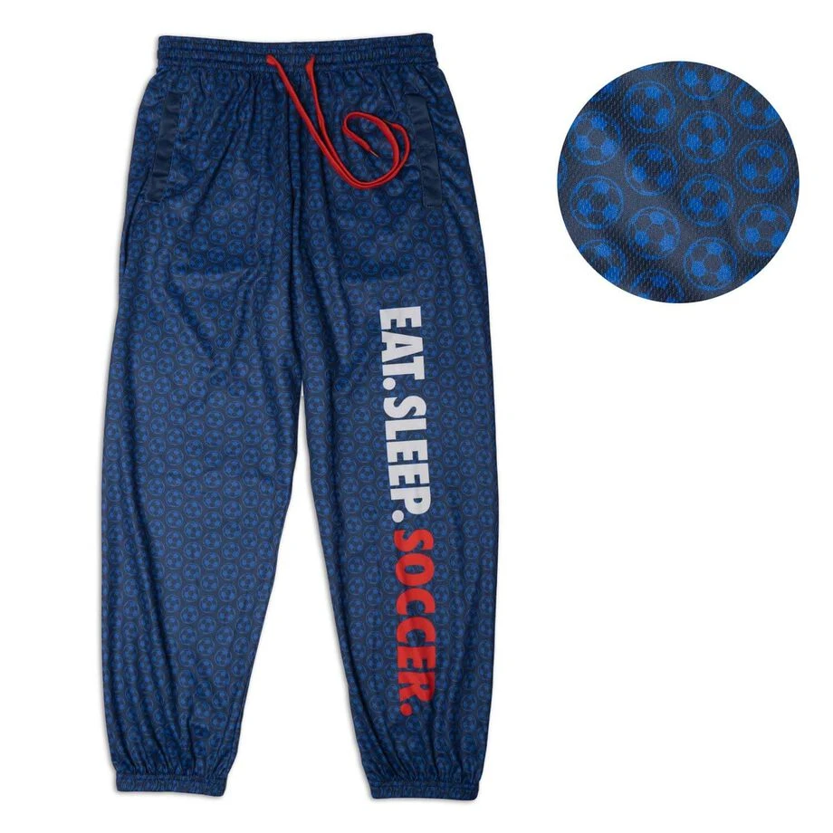 Get comfy in a pair of our soccer lounge pants with a fun eat sleep soccer design, whether at home or on the field these lounge pants are sure to be a goal for all occasions. These lounge pants are made from 100% performance polyester, which makes them great to wear year round. Our lounge pants also feature a comfortable elastic waistband with a drawstring, along with side pockets and elastic ankles. A pair of these lounge pants make for a great gift for any occasion.